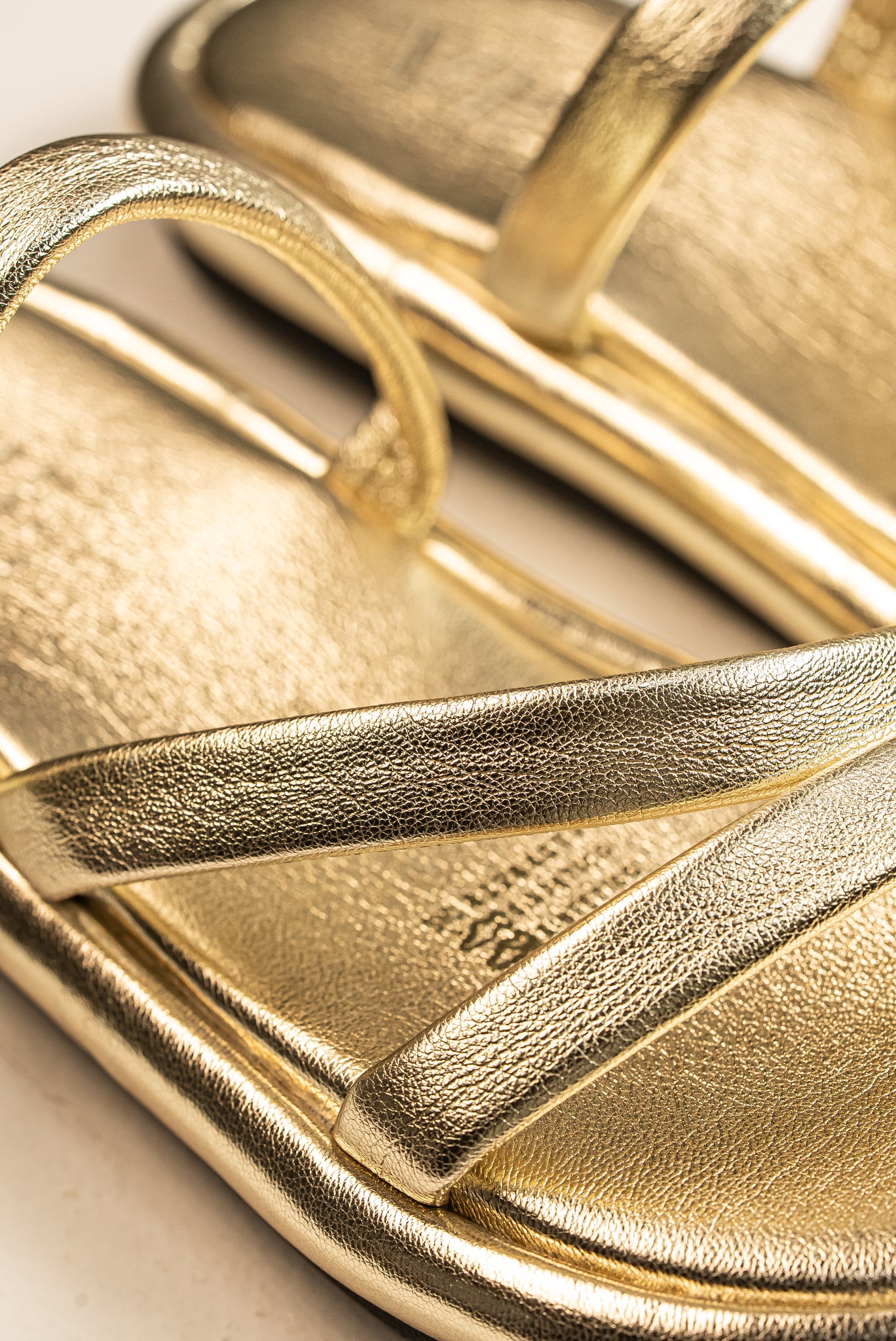 Con un acabado metálico dorado vibrante y un diseño de tiras finas en la capellada, este modelo es sinónimo de lujo y comodidad. Ideal para el día a día o para complementar tu outfit de noche con un brillo sutil.