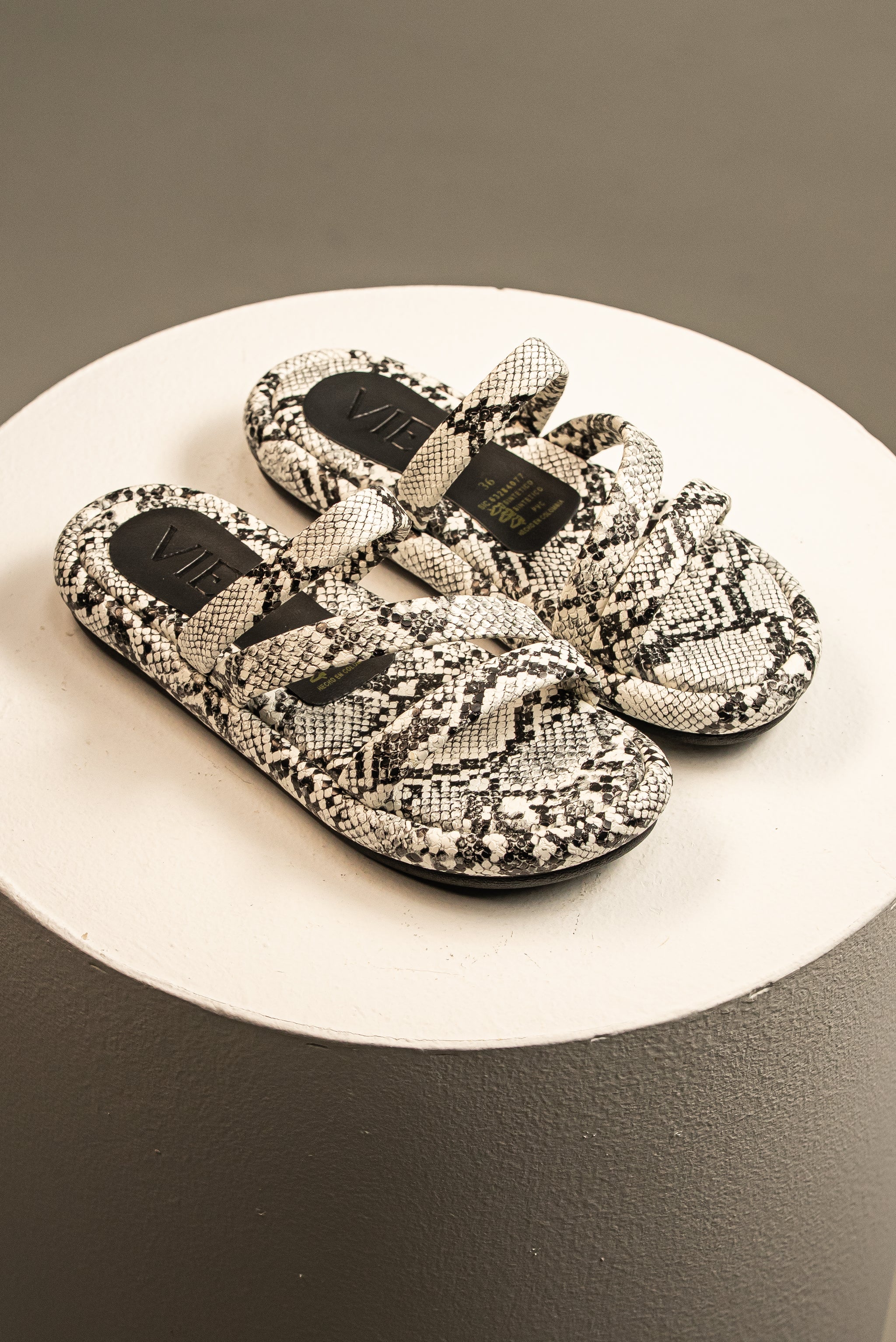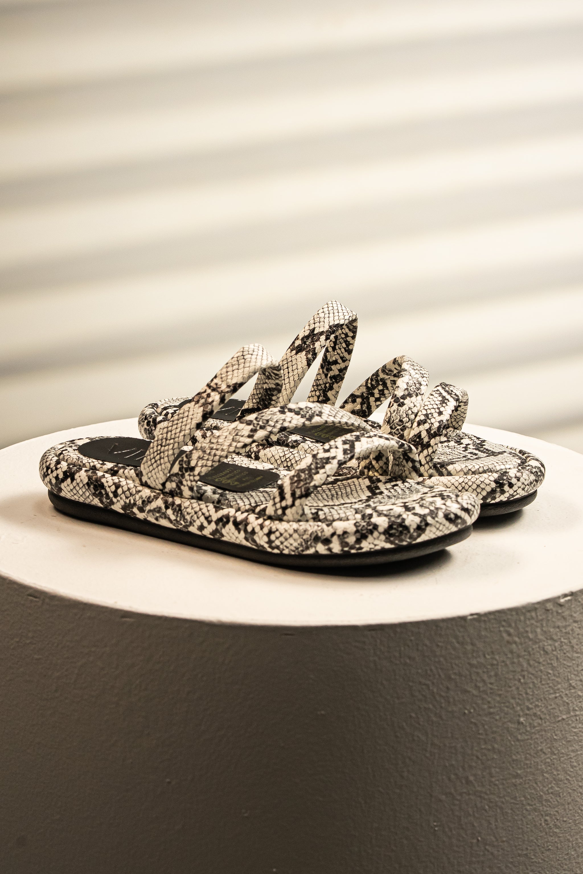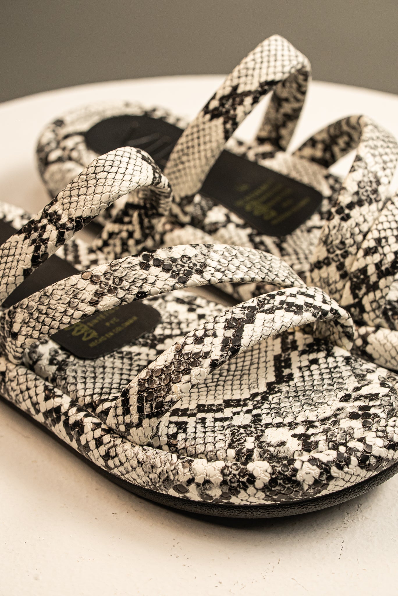 Estampado Salvaje y Comodidad Clásica Una reinvención audaz de un clásico. Esta sandalia destaca por su estampado de piel de serpiente en alto contraste (negro y blanco) y un diseño de doble tira que evoca el estilo Mary Jane o doble hebilla.