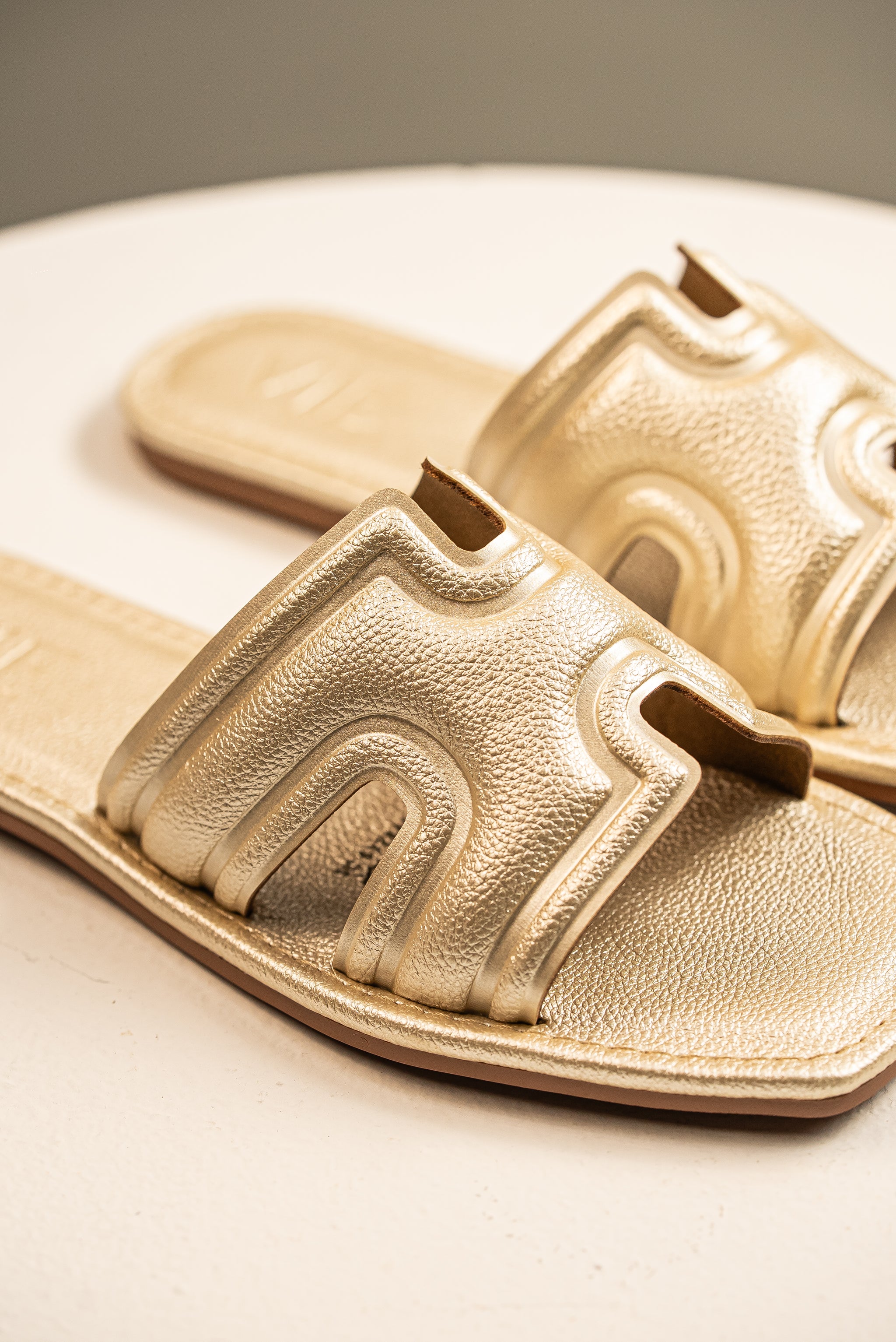 Esta sandalia plana tipo slide presenta un diseño icónico con su tira frontal geométrica y elegante en forma de herradura, realzada por un impresionante acabado metálico dorado (champaña). Es la opción perfecta para añadir un aire de lujo y sofisticación a cualquier look, desde la playa hasta la cena.