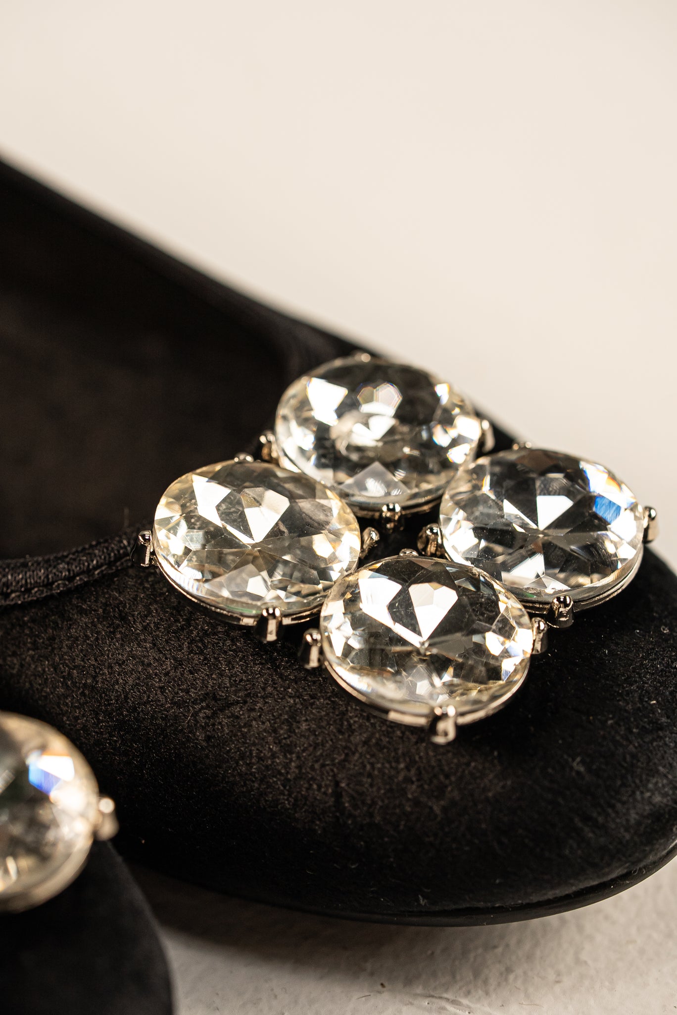 El diseño clásico de la baleta es dramáticamente transformado por un impresionante adorno joya en la punta, compuesto por cuatro grandes cristales que simulan la forma de un trébol. Este detalle espectacular convierte a estas flats en la alternativa perfecta a los tacones, asegurando un glamour de alfombra roja en cualquier evento nocturno o celebración.