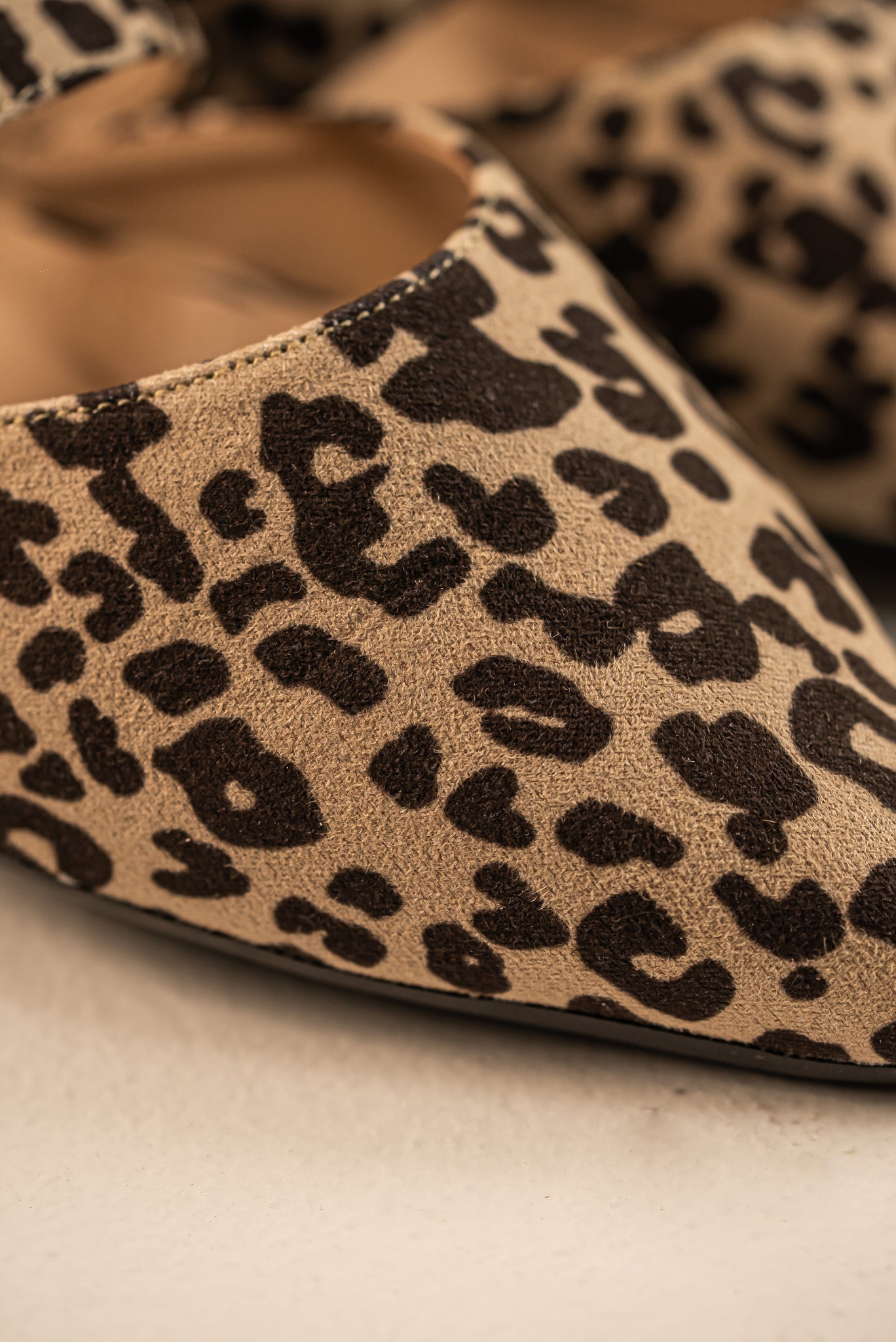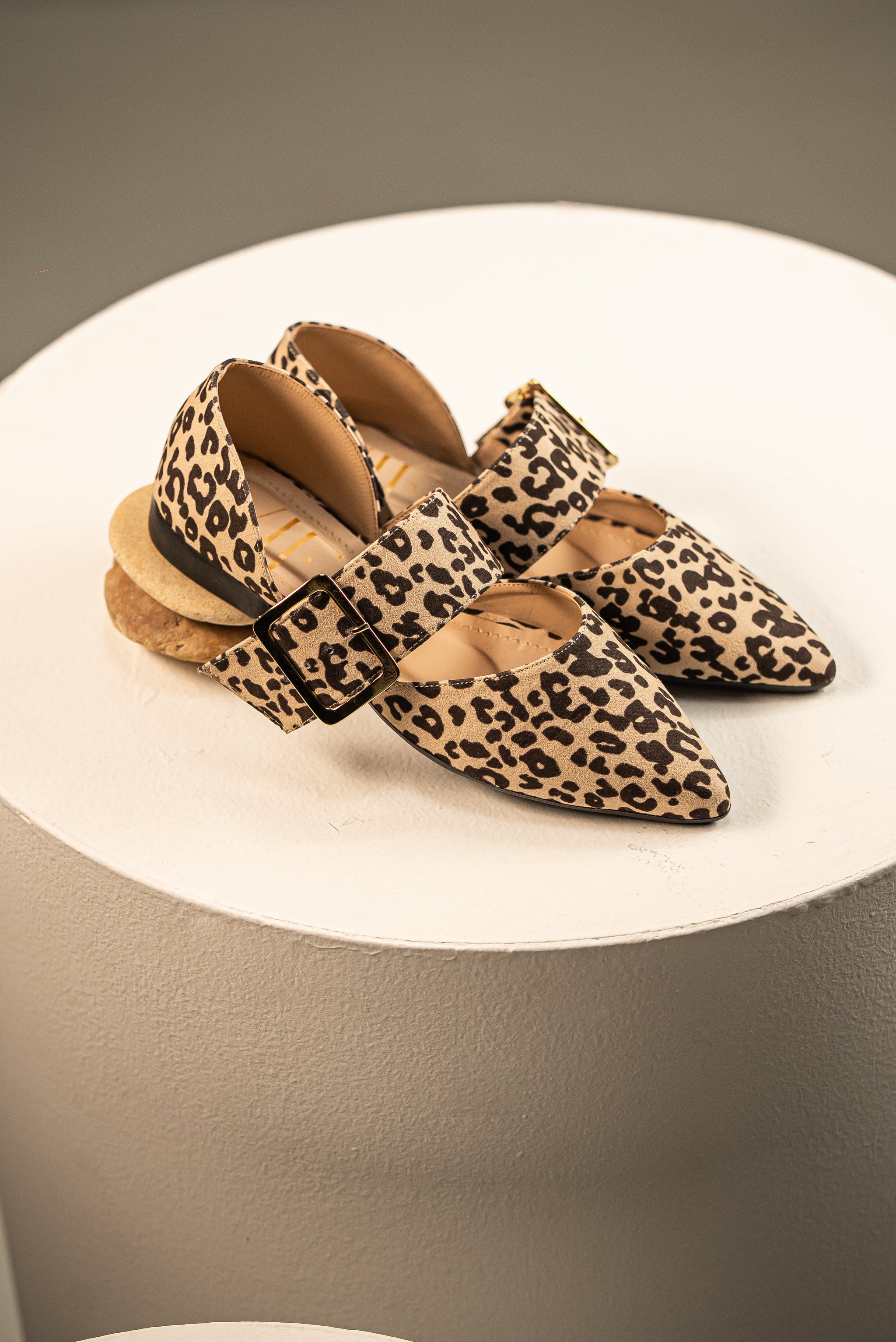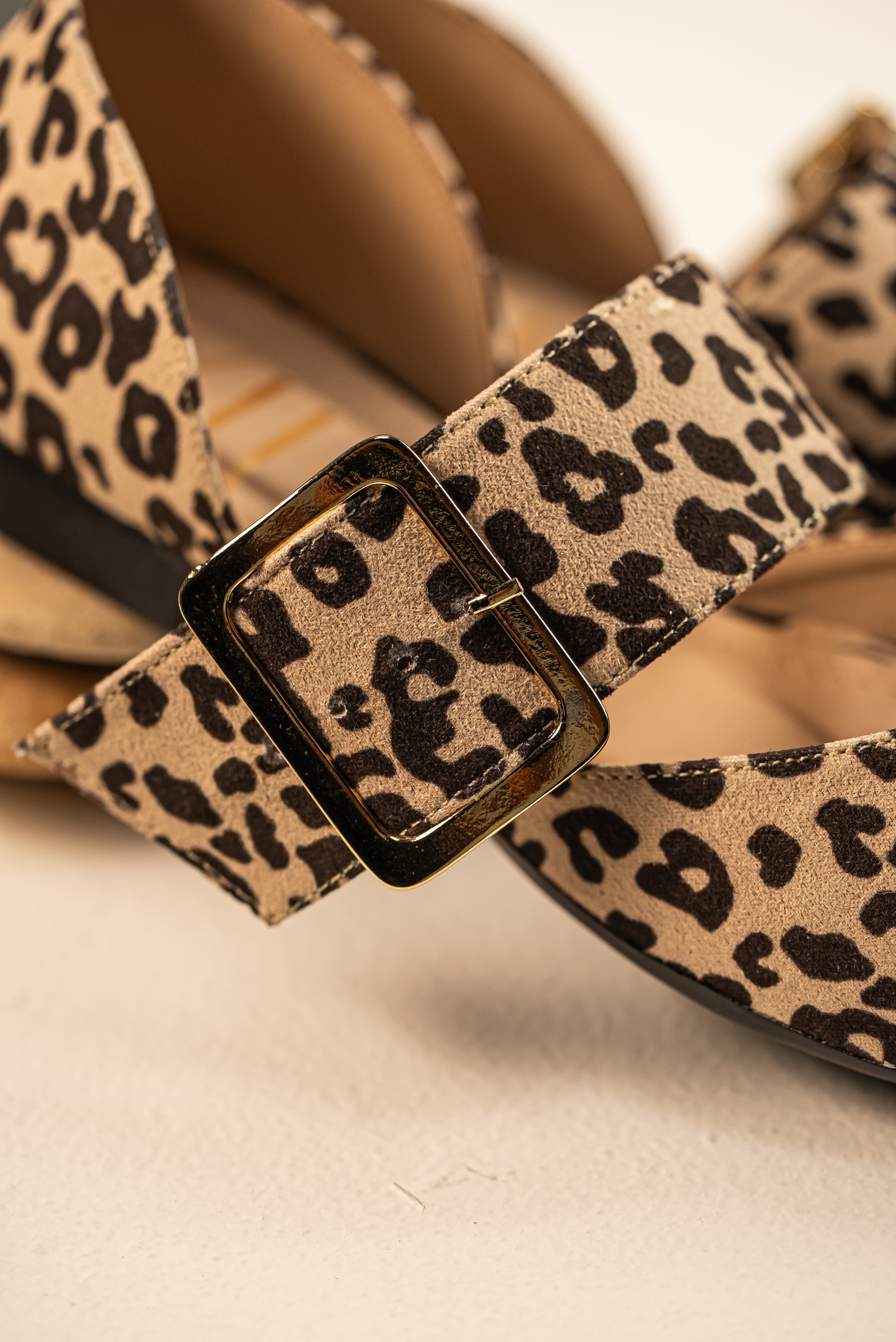 Están elaboradas con cuero sintético de alta calidad que imita la suavidad del suede o gamuza, en un atemporal estampado de leopardo con tonos neutros. Su diseño de corte lateral (D'Orsay) estiliza el pie, y la correa Mary Jane con hebilla $oversize$ añade un toque de modernidad.