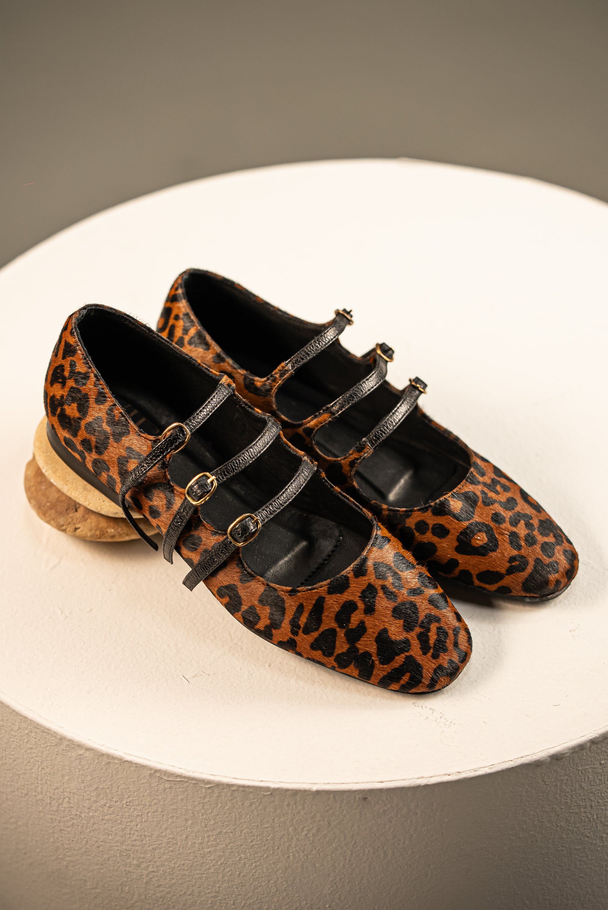 Están diseñadas en cuero de alta calidad con un acabado de pelo sedoso y un profundo estampado de leopardo. El diseño se moderniza con tres elegantes correas de cuero negro que cruzan el empeine, ofreciendo un ajuste sofisticado y un toque visual impactante.