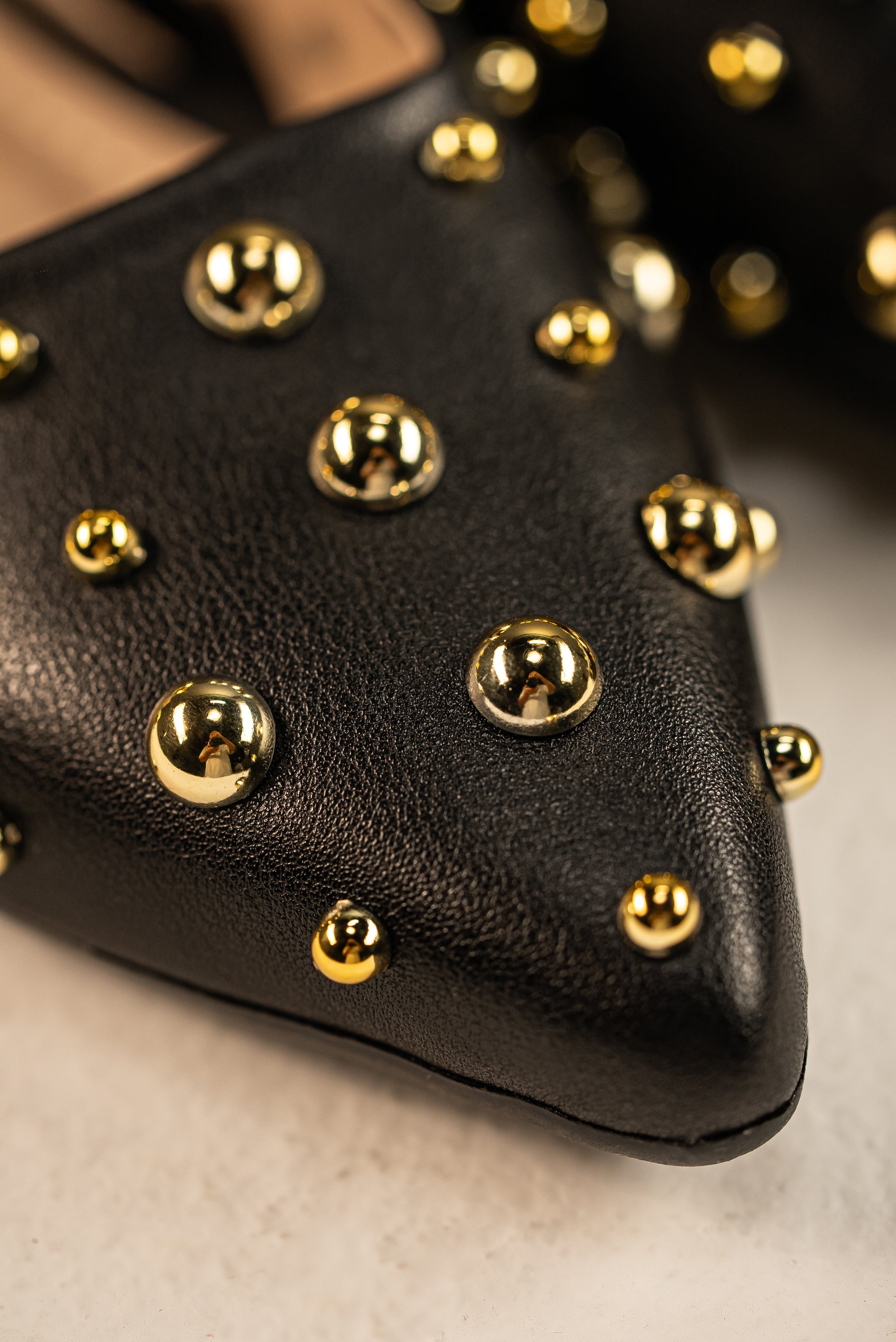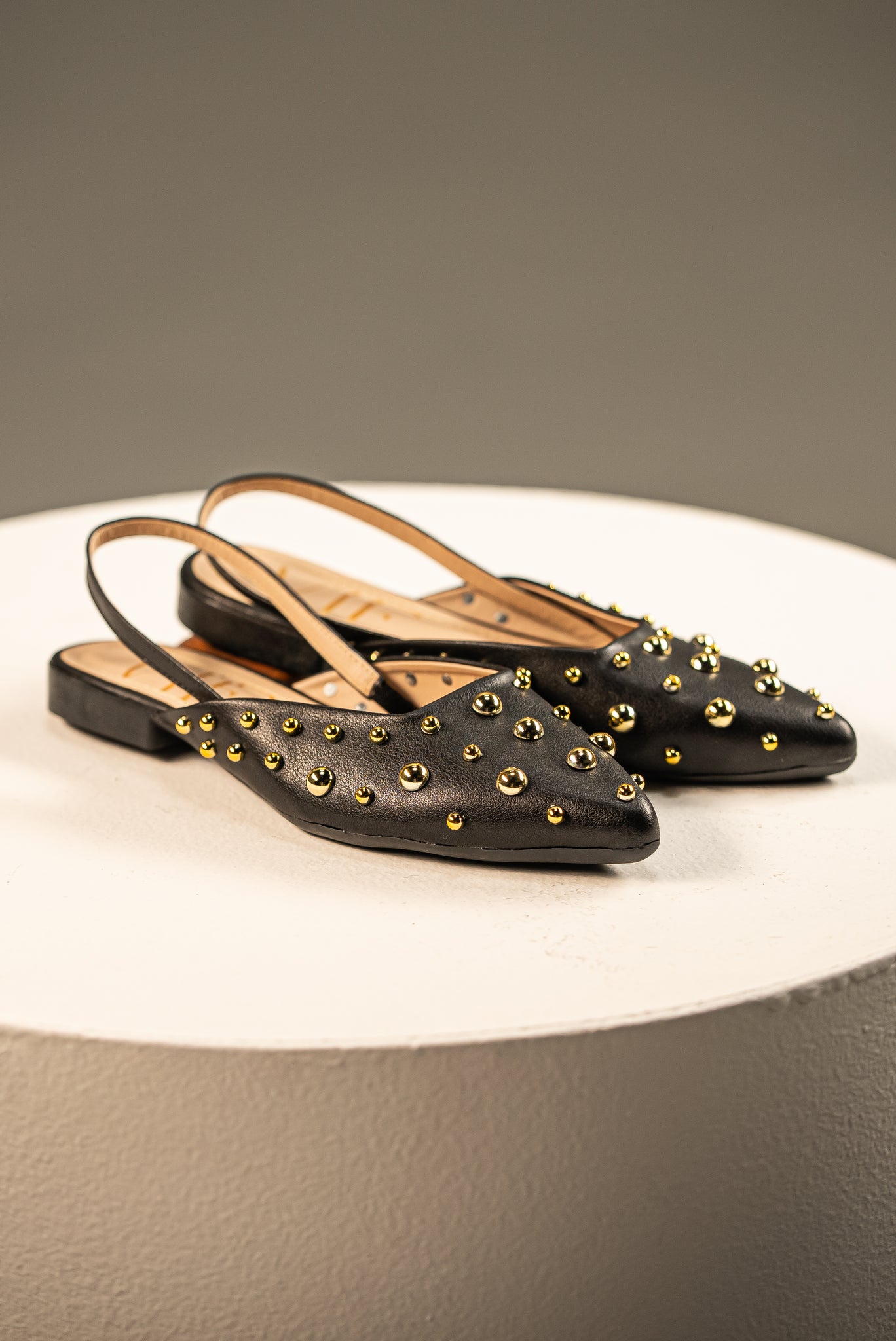 Confeccionadas en material sintético de un negro profundo, estas baletas en punta y estilo slingback destacan por su llamativo contraste. Están adornadas con tachuelas doradas de distintos diámetros que capturan la luz y garantizan que cada paso que des atraiga todas las miradas.