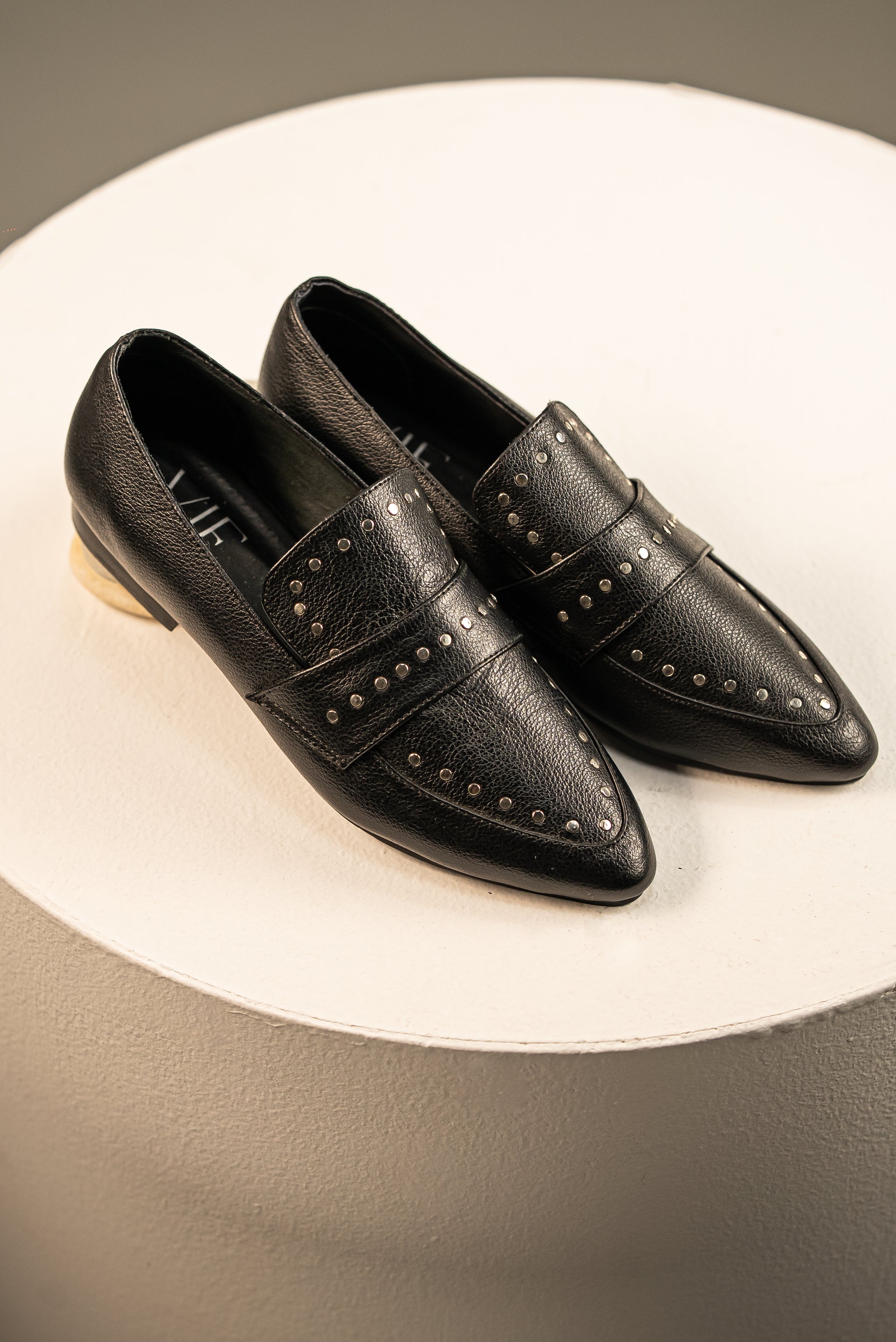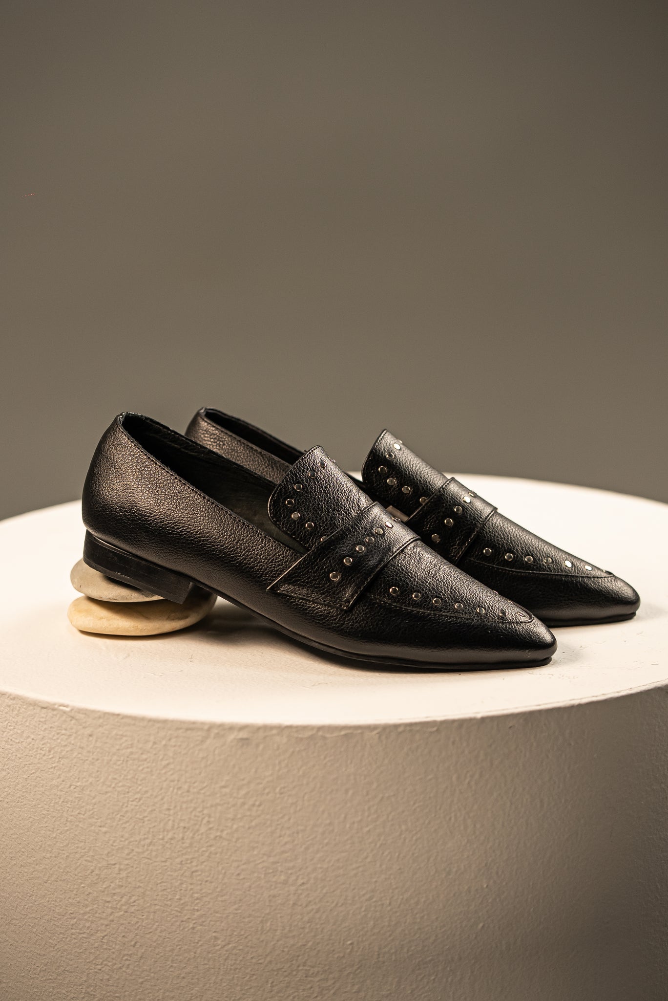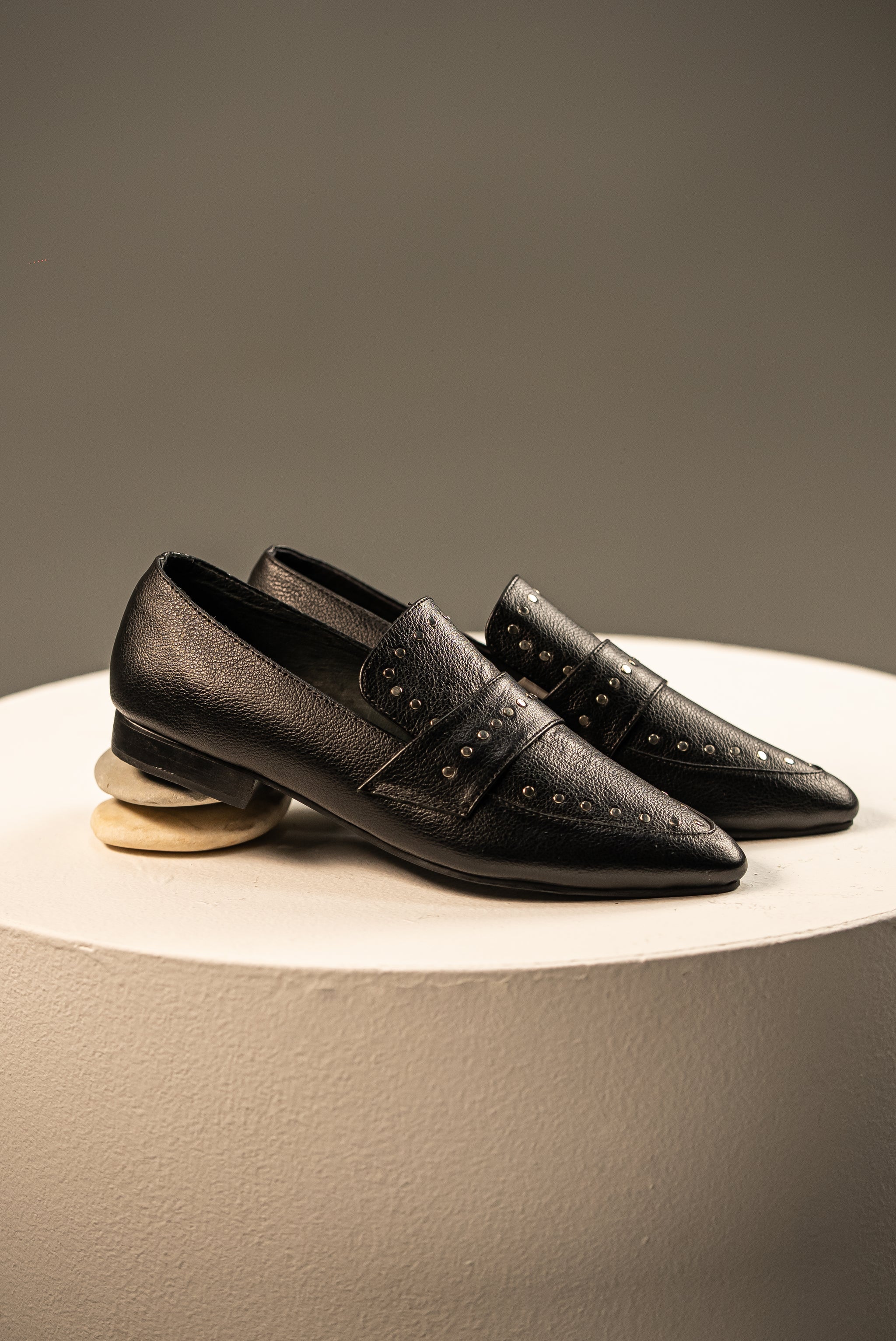 Un giro audaz al clásico mocasín. El Mocasín Amada Tachas combina la elegancia atemporal de la piel negra con una dosis de actitud rock-chic. Los delicados estoperoles metálicos adornan la pala y la puntera afilada, convirtiendo este calzado plano en una pieza llamativa y vanguardista. Perfecto para quienes buscan un toque de rebeldía sofisticada en su look diario.