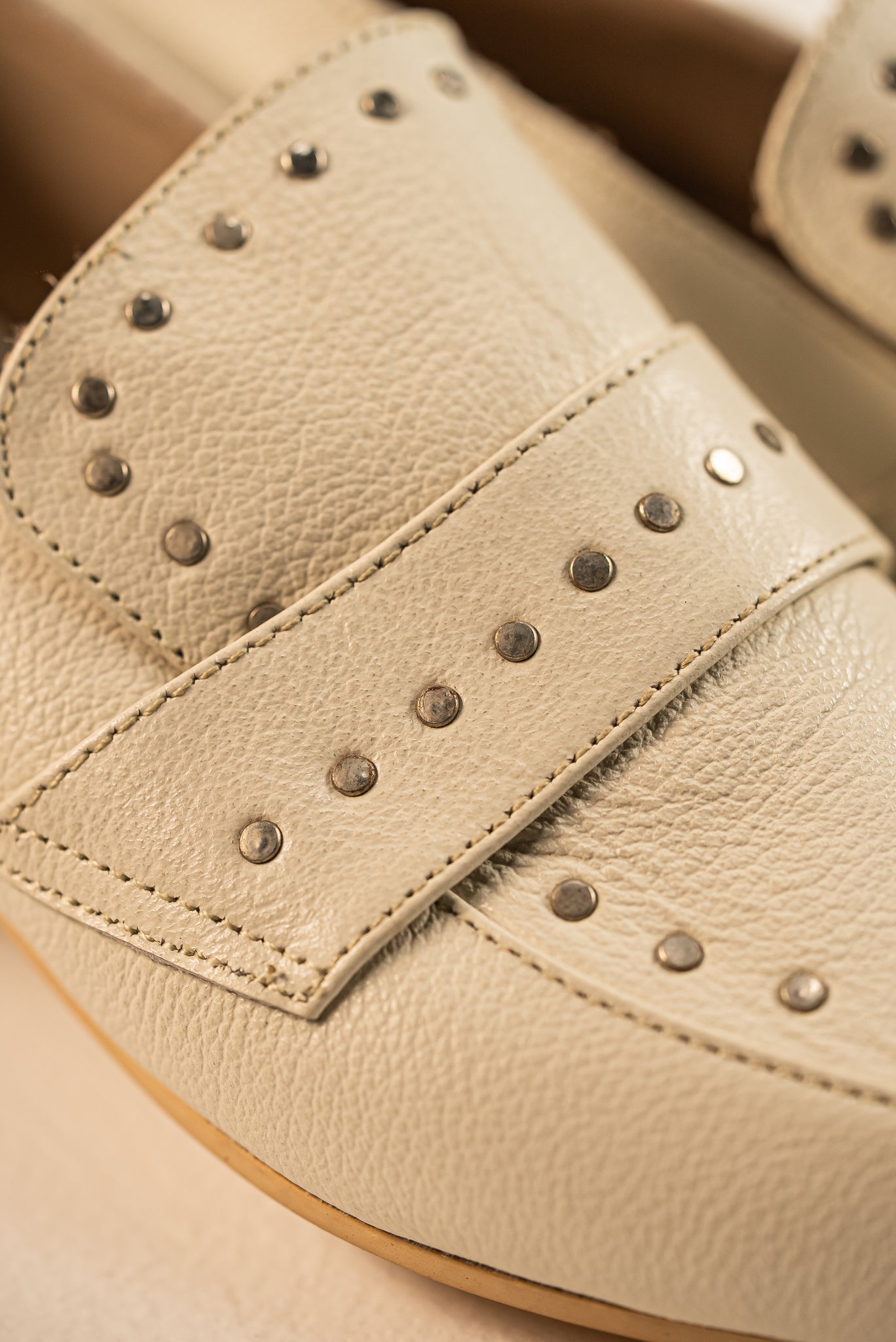 A la vanguardia de la moda. Este Loafer Amada captura la tendencia de los detalles metálicos en un color neutro y cómodo. El tono hueso/crudo lo hace increíblemente versátil para todas las estaciones, mientras que las tachuelas le dan un aire moderno y desenfadado. Un zapato plano cómodo, diseñado para la mujer que no teme destacar con elegancia.