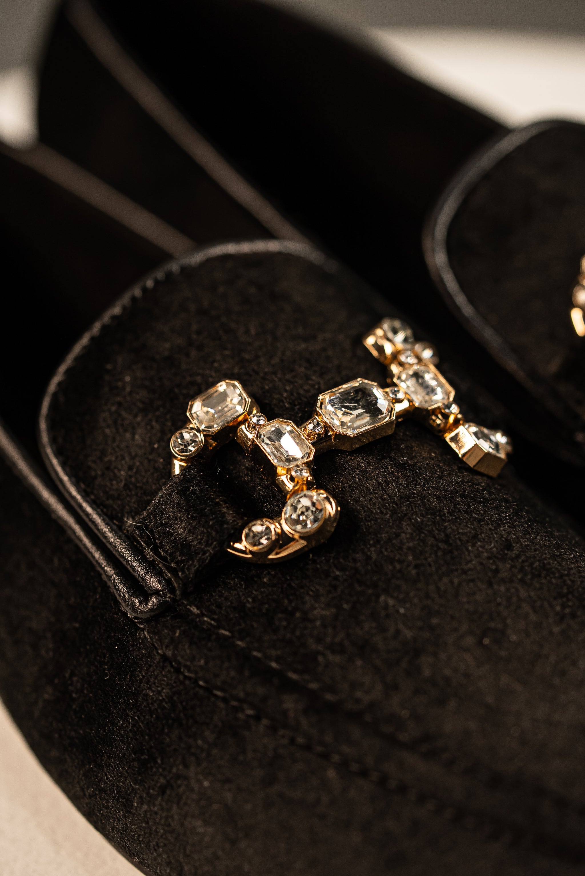 Confeccionado en un lujoso material aterciopelado negro, este calzado de silueta clásica y estilizada está adornado con una hebilla dorada incrustada de cristales deslumbrantes. Es la opción perfecta para sustituir los tacones en eventos especiales o elevar cualquier outfit de noche con un aire de glamour atemporal.