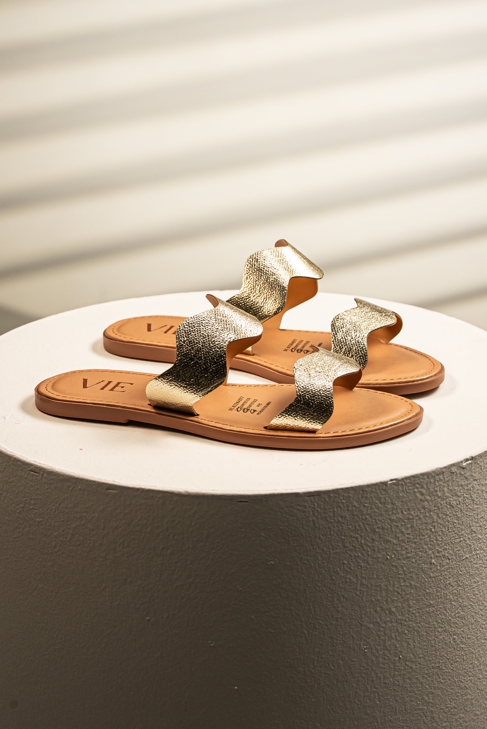 Un slide plano imprescindible para la temporada. Este diseño combina el brillo de un acabado metálico dorado texturizado con una cómoda plantilla color caramelo. Sus tiras anchas con un elegante borde ondulado le dan un toque sofisticado y moderno.