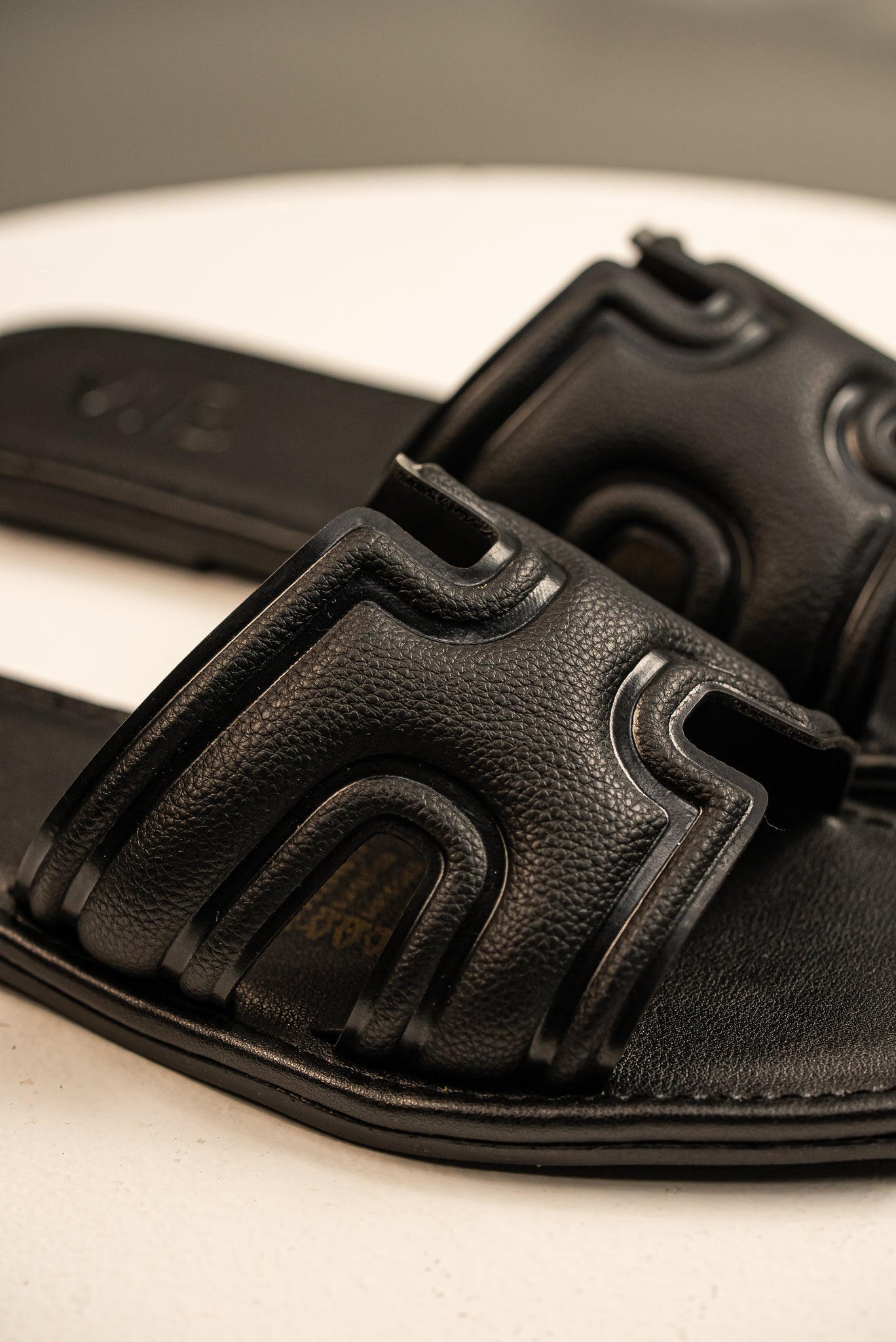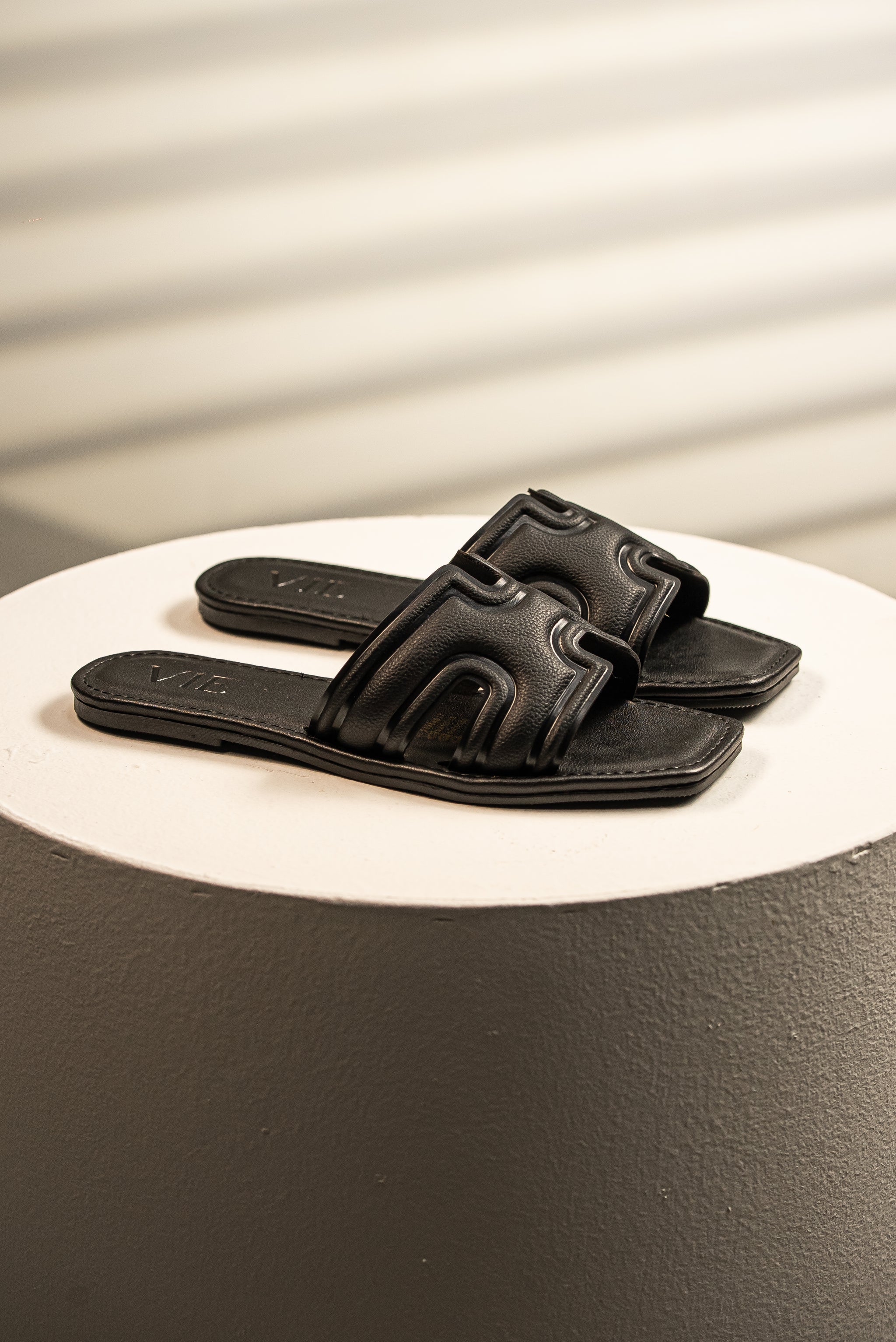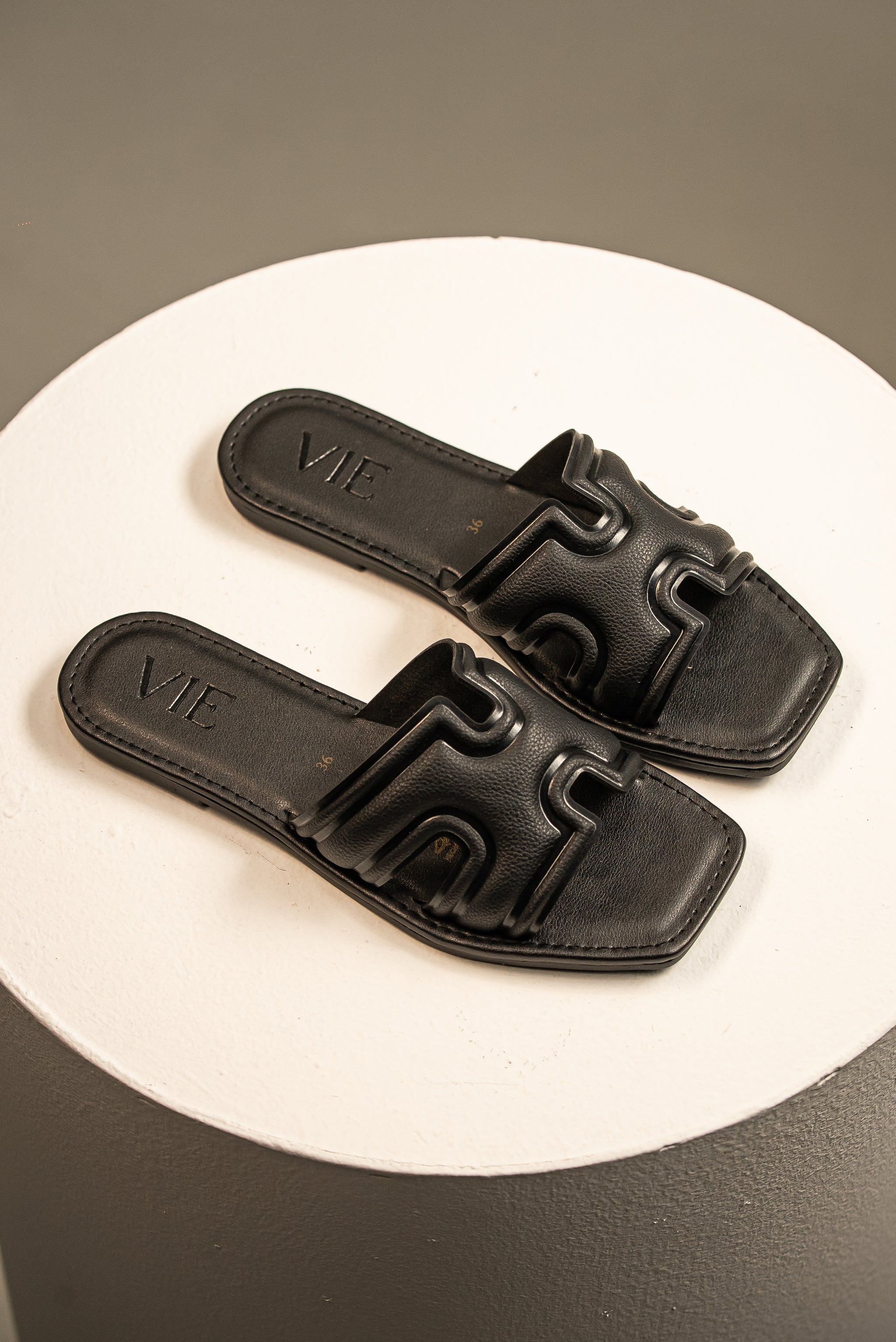 Esta sandalia plana tipo slide presenta el distintivo diseño de tira geométrica en una sofisticada versión completamente negra. Un modelo versátil y chic, perfecto para combinar con todo, desde outfits casuales hasta conjuntos más formales de noche. Un básico imprescindible con un toque de diseño de lujo.