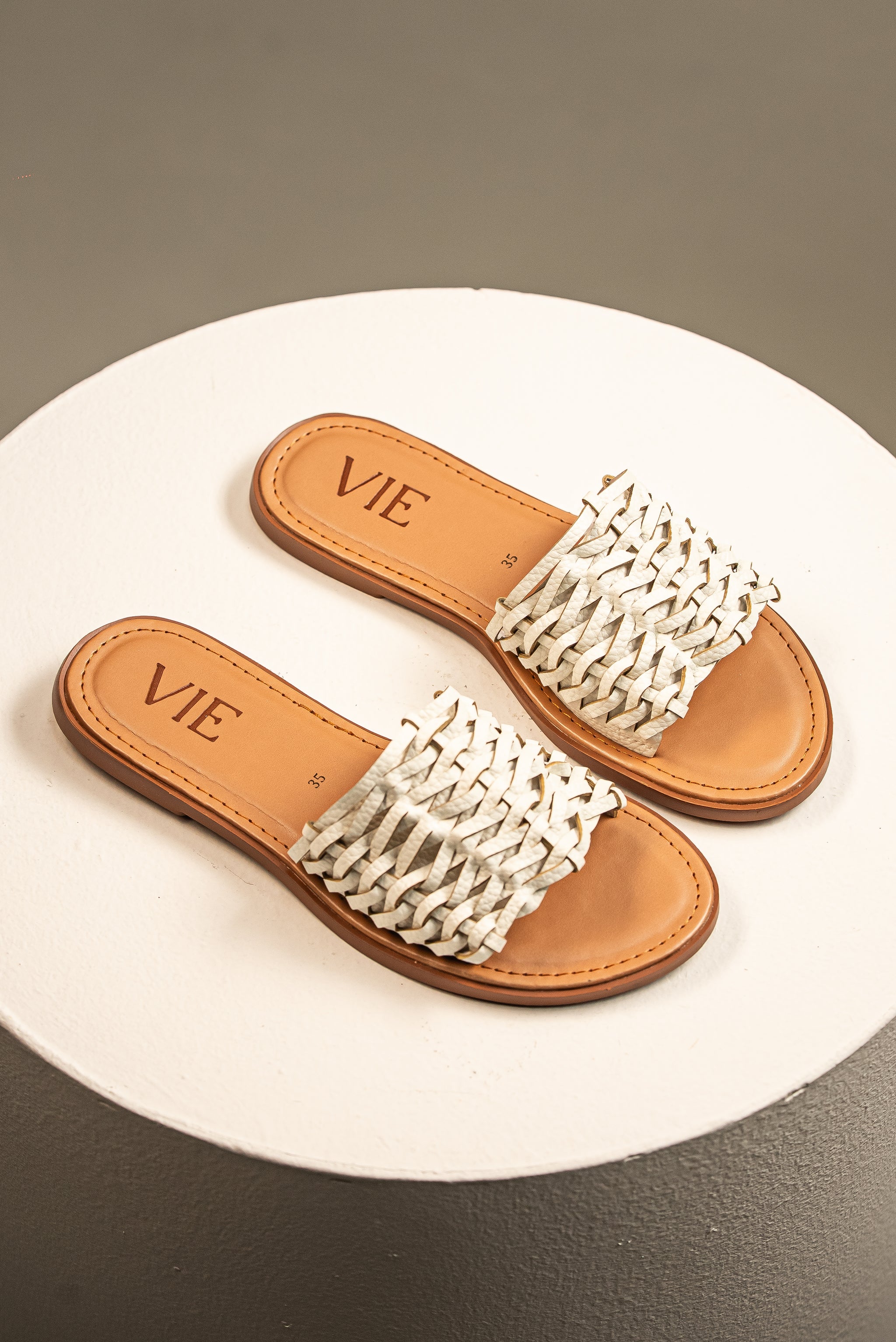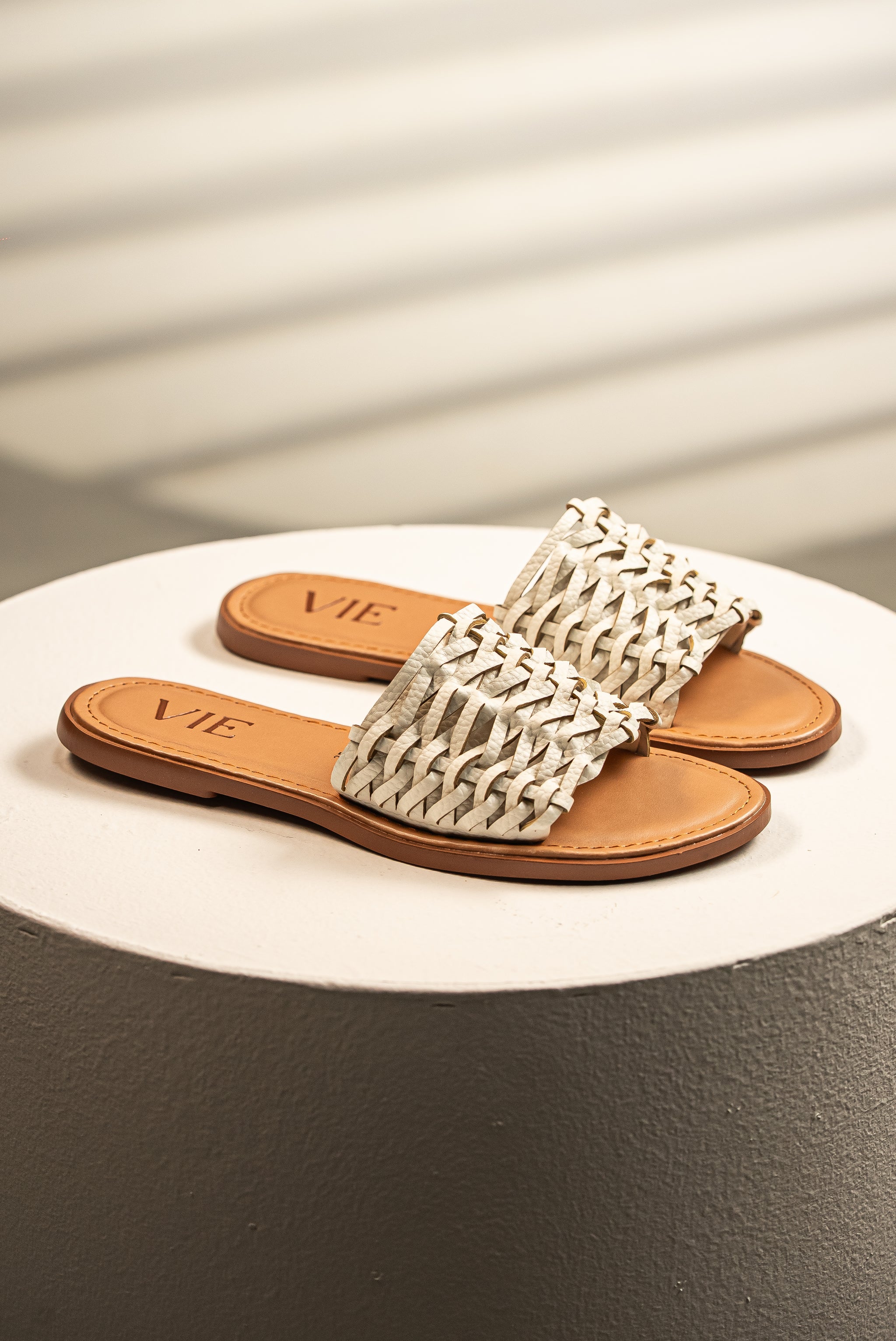 Este slide plano destaca por su ancha banda tejida en color blanco hueso, creando una textura sofisticada. Su cómoda suela en tono caramelo natural complementa el diseño veraniego. Es la opción perfecta para un look casual, elevando desde un vestido de lino hasta tus jeans favoritos.