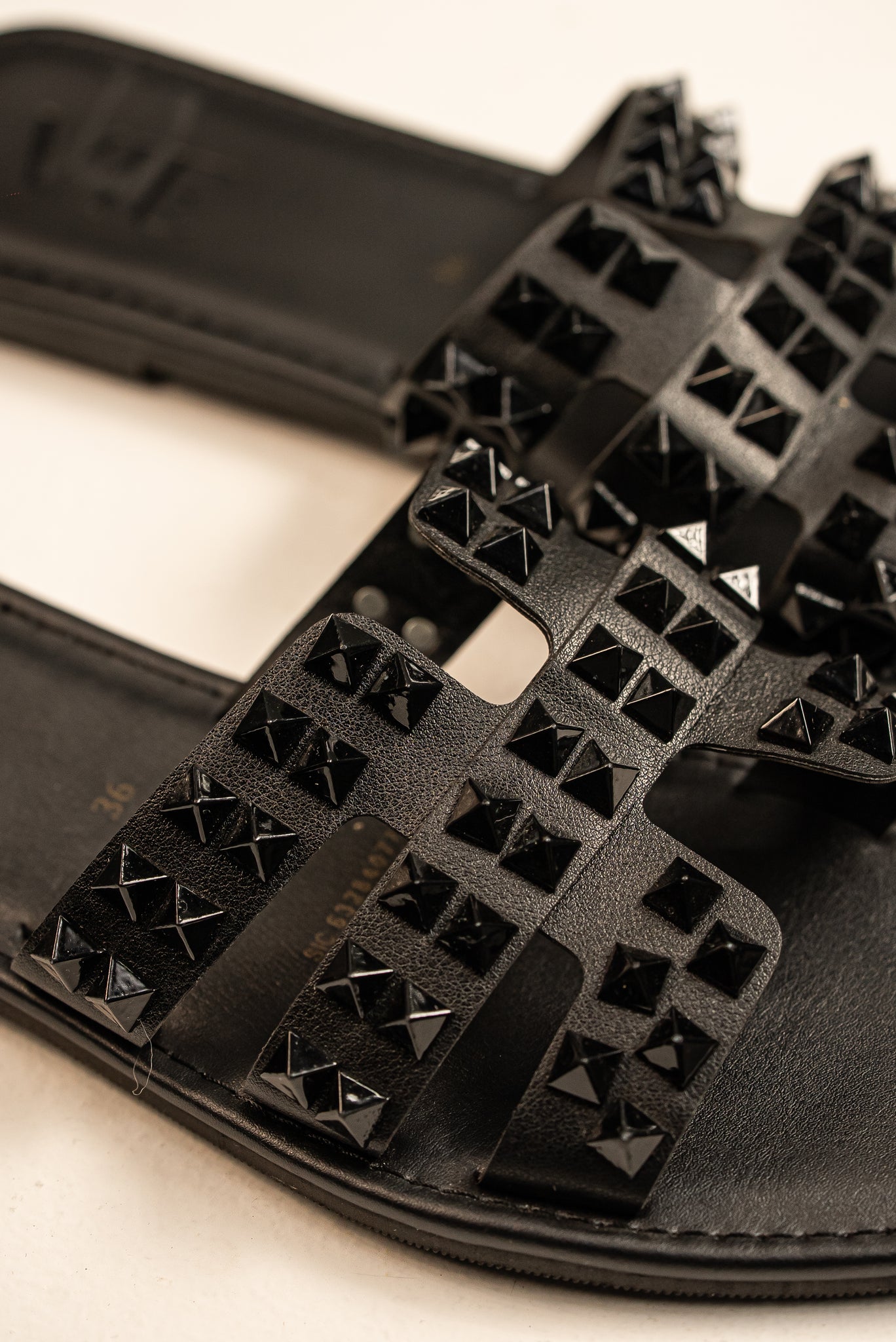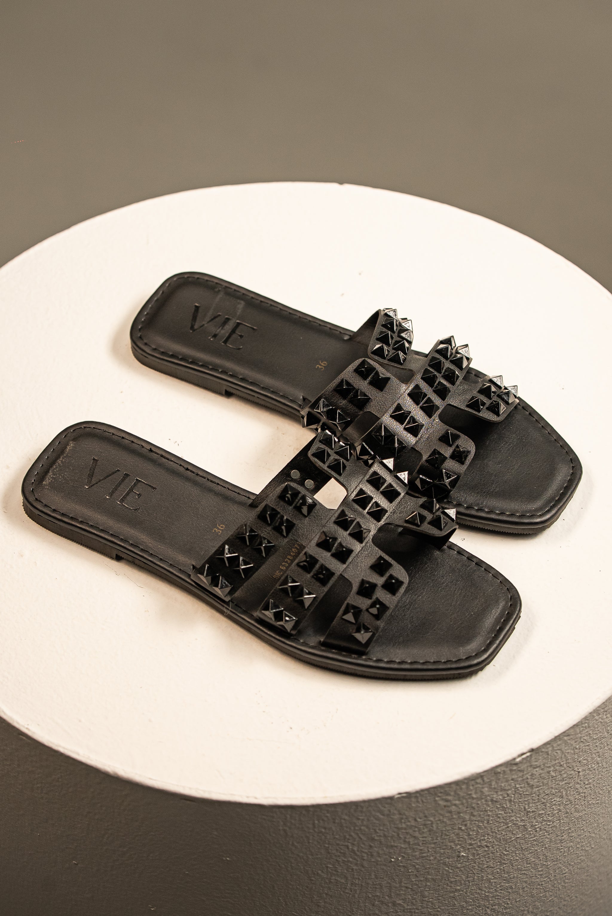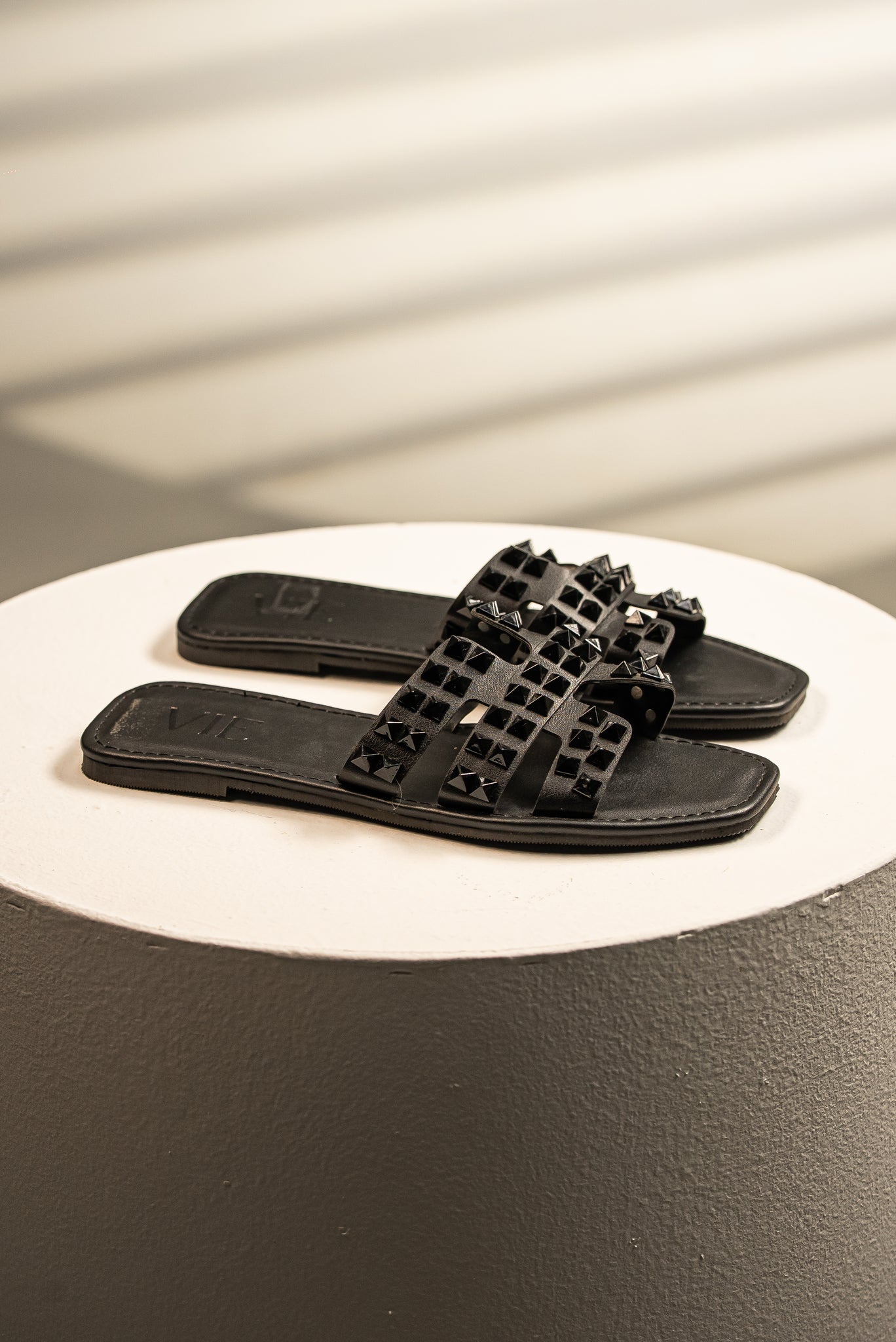 Sandalia plana de dama en color negro que combina estilo y actitud. El diseño se caracteriza por su pala de tiras Múltiple totalmente cubierta con tachuelas (o estoperoles) de acabado brillante en el mismo tono negro. Su punta cuadrada y su diseño slide ofrecen un calce rápido y cómodo. Un modelo atrevido e ideal para añadir un toque punk-chic a cualquier conjunto casual.