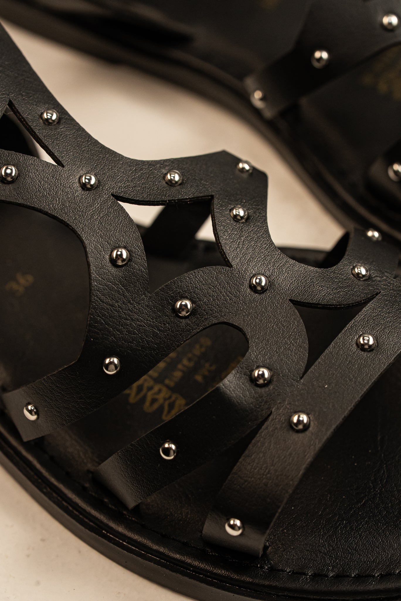 Este diseño toma la silueta Gladiadora baja y la moderniza con un color negro intenso y elegantes tachuelas plateadas a lo largo de las tiras. Con su diseño de tiras entrecruzadas y ajuste de tobillo, ofrece un estilo rocker sofisticado que se puede usar en cualquier momento del día. Un básico versátil y cómodo con personalidad.