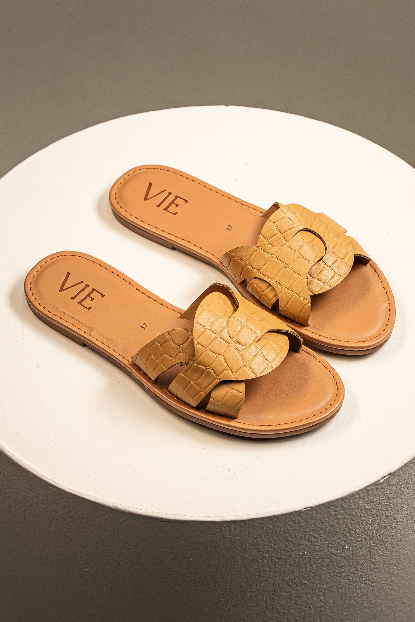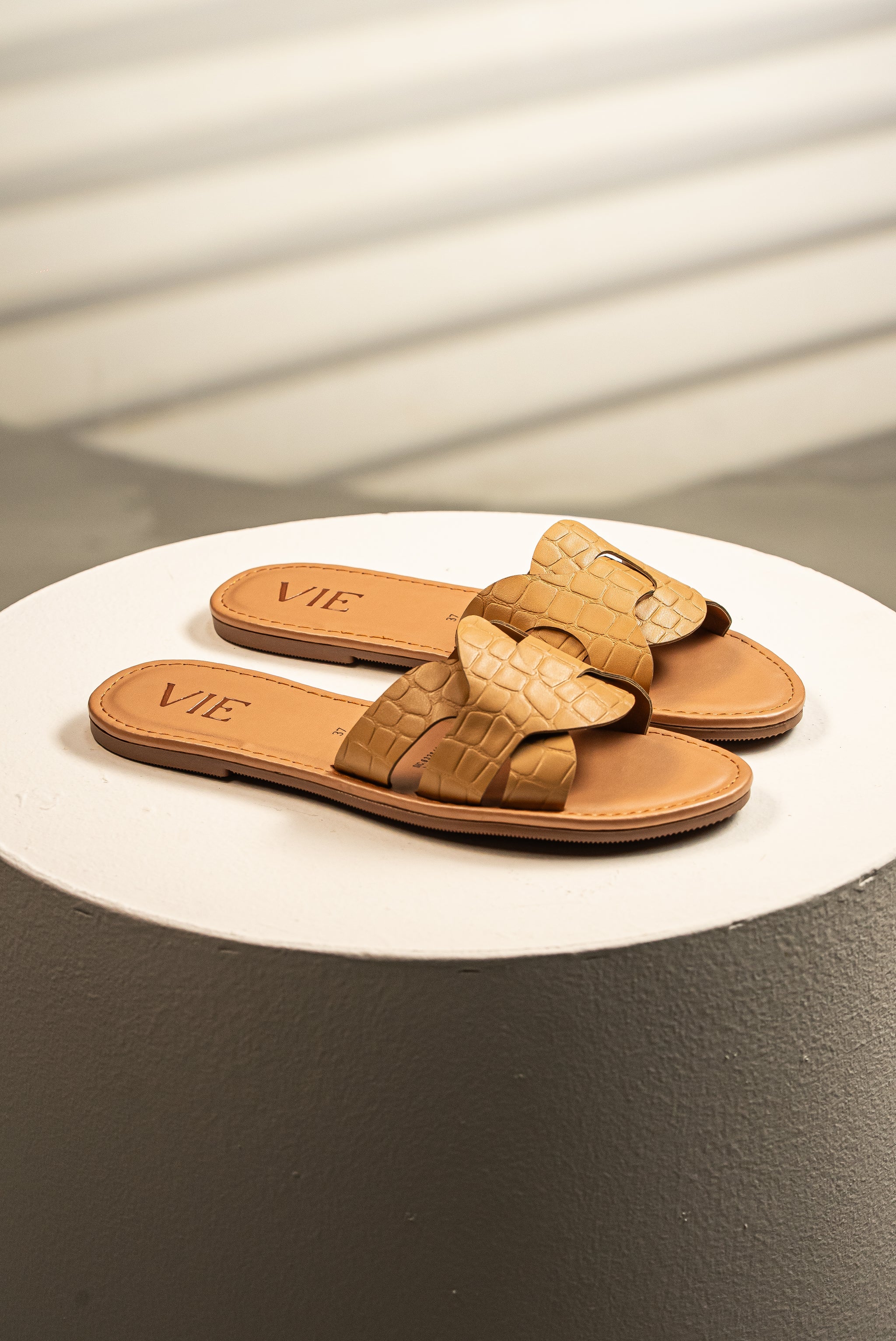 El lujo exótico en tu calzado diario. Esta sandalia slide combina el diseño clásico y elegante de tira geométrica con una moderna y sofisticada textura croco print. El cálido color camel es versátil y atemporal, ideal para llevar tus looks de día a noche. Un calzado plano y cómodo con una declaración de estilo audaz.