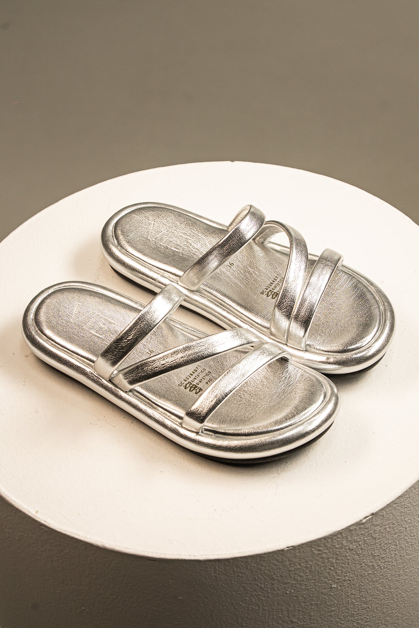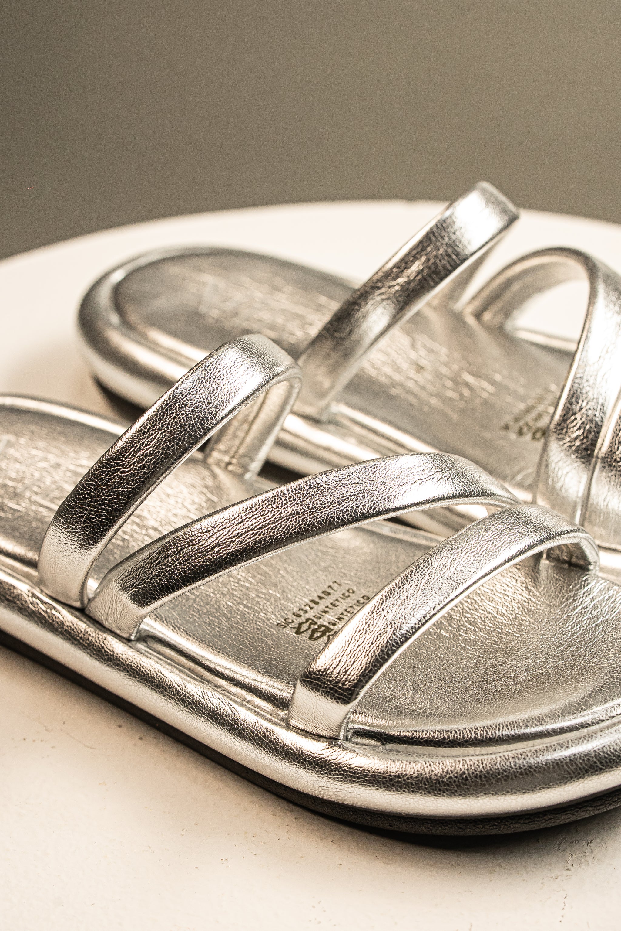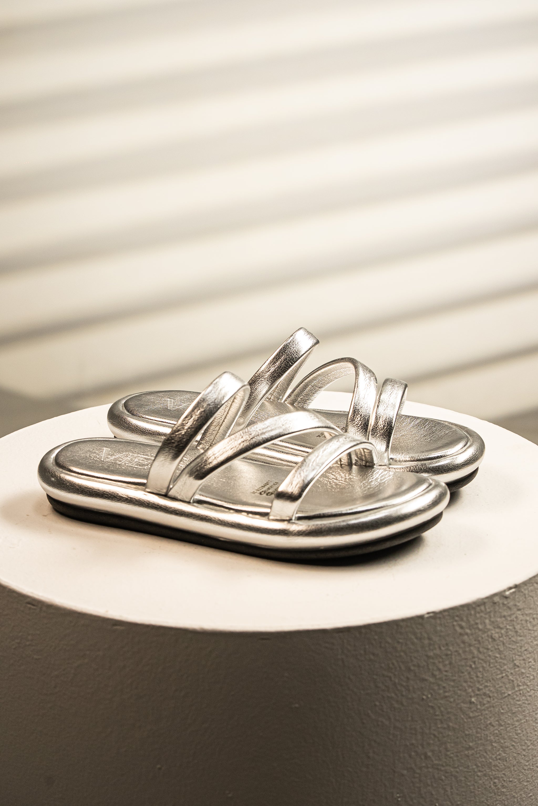 Las sandalias combinan la tendencia metálica más actual con la comodidad de un diseño plano. Con sus elegantes tiras dobles y su acabado plateado brillante, son el calzado perfecto para añadir un toque futurista y sofisticado a cualquier look.
