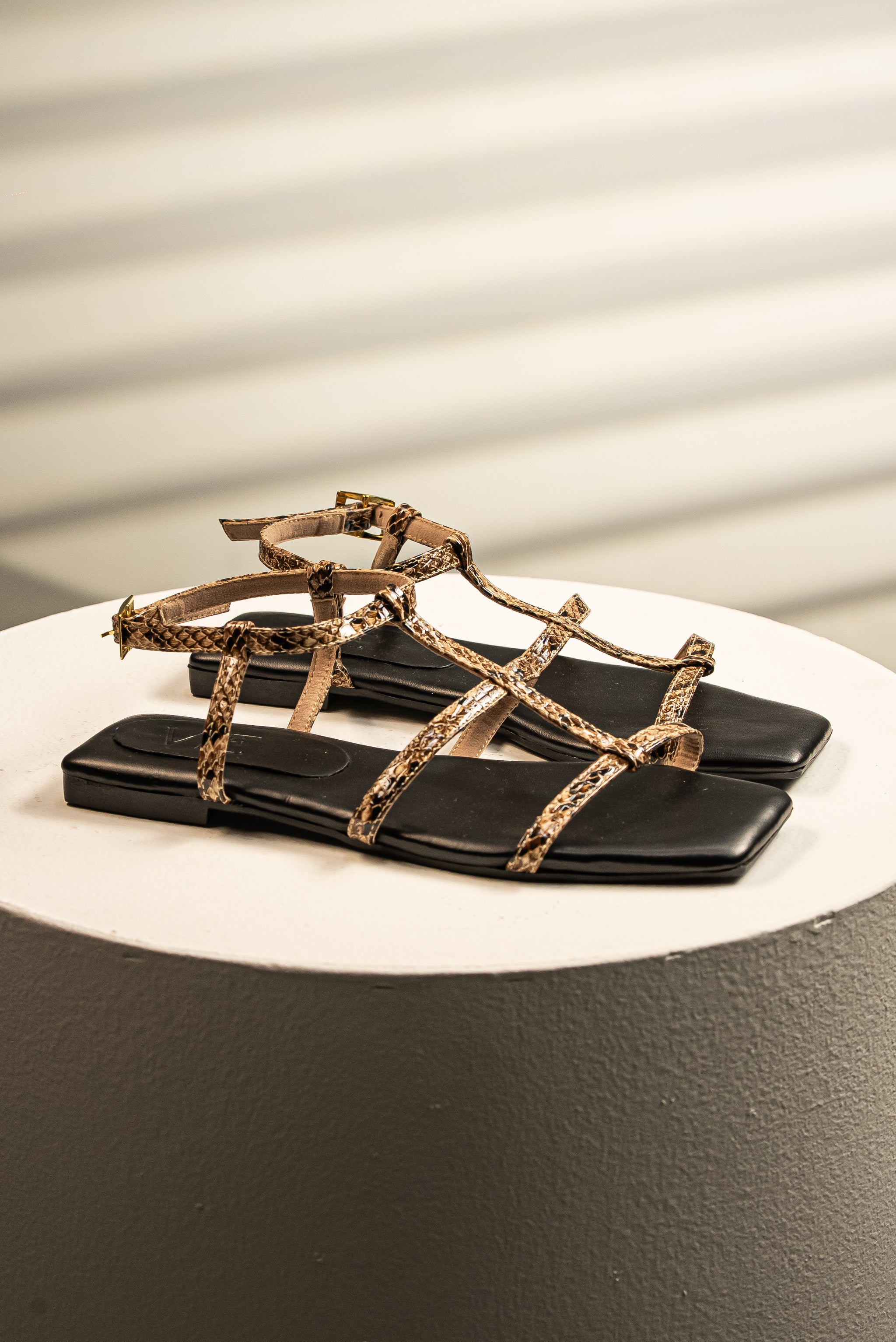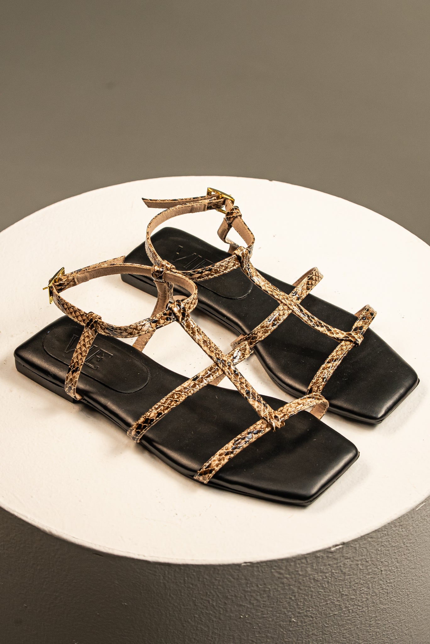 Un diseño audaz que combina la tendencia de la punta cuadrada con el toque exótico del estampado de serpiente en las tiras. Esta sandalia plana strappy presenta una base negra elegante que hace que el print se destaque sutilmente. Su correa ajustable al tobillo garantiza soporte y la convierte en el calzado perfecto para darle un giro salvaje y moderno a tus outfits casuales o semi-formales.