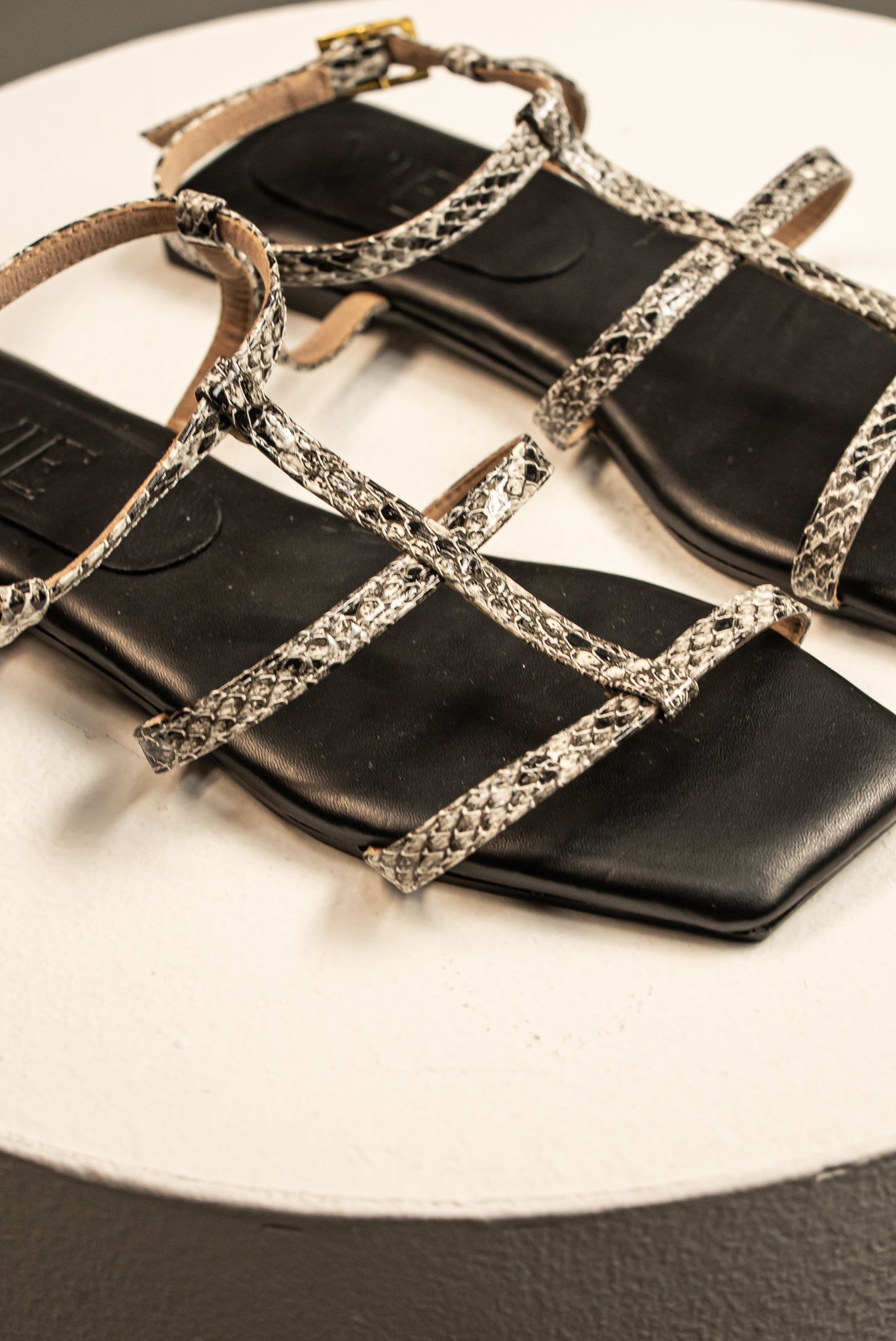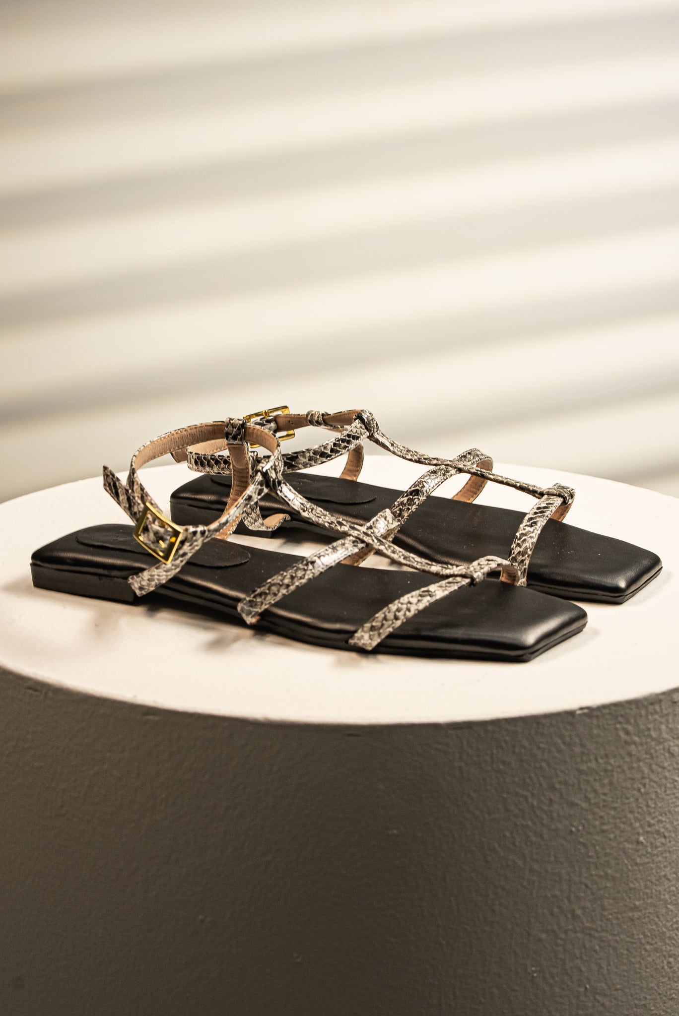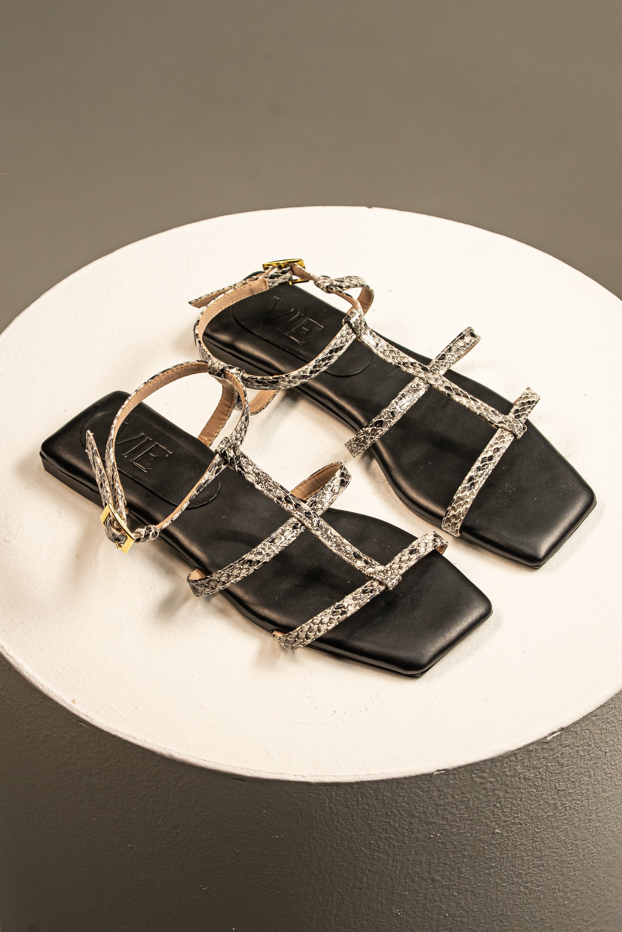 La silueta de punta cuadrada más vanguardista se une a un estampado de serpiente en tonos grises y blancos. Esta sandalia plana strappy es perfecta para quienes buscan un toque de Animal Print sofisticado y menos contrastante. La plantilla negra proporciona una base elegante y atemporal. Su diseño de tiras finas y correa ajustable al tobillo la convierten en un calzado cómodo, ideal para transicionar del día a la noche con un estilo minimalista y moderno.
