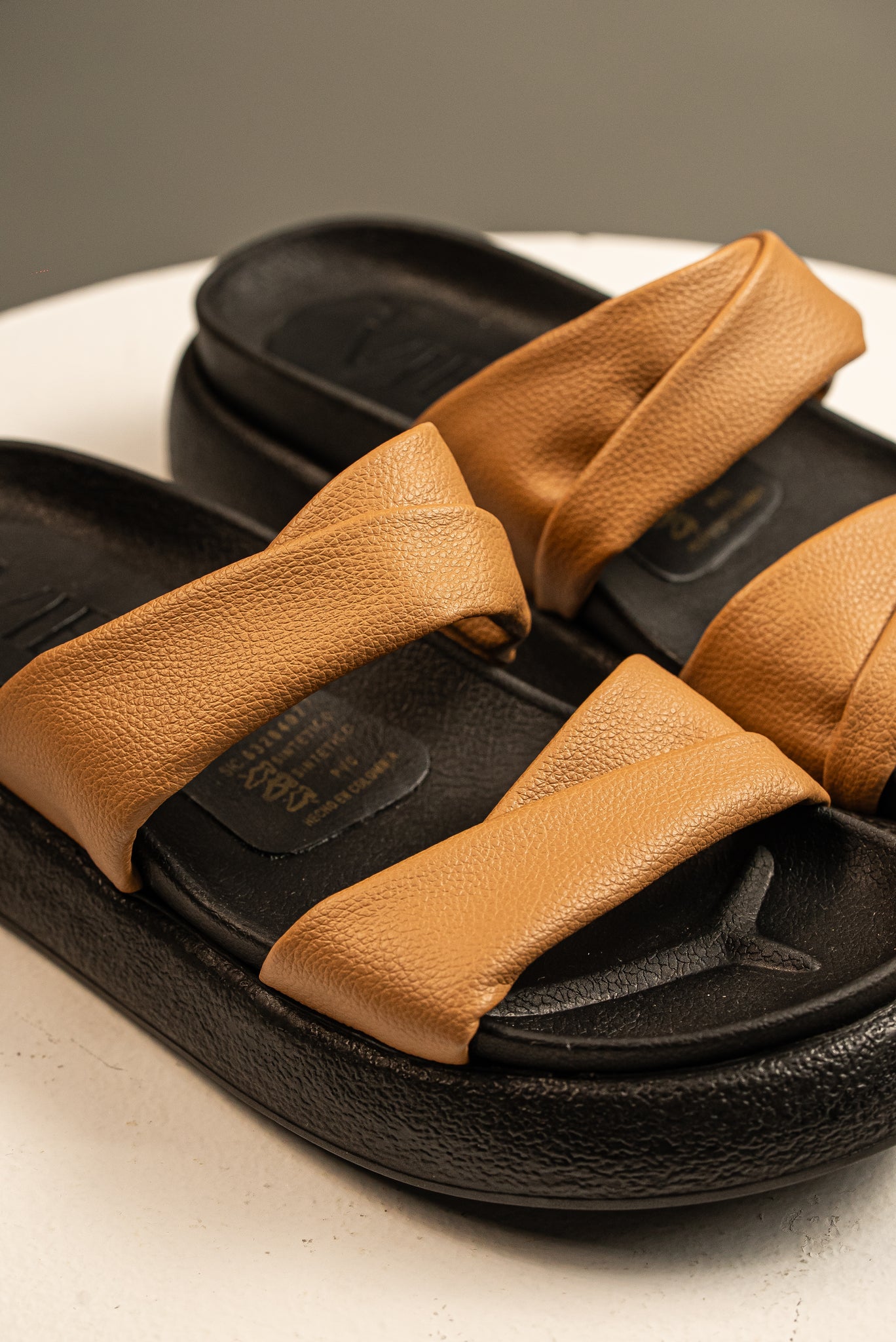 Esta sandalia slide presenta una suela chunky y robusta de color negro que garantiza máxima comodidad y soporte. El contraste lo crean las dos correas anchas de cuero sintético suave con un bello tono caramelo o camel, que tienen un ligero efecto abullonado o fruncido.