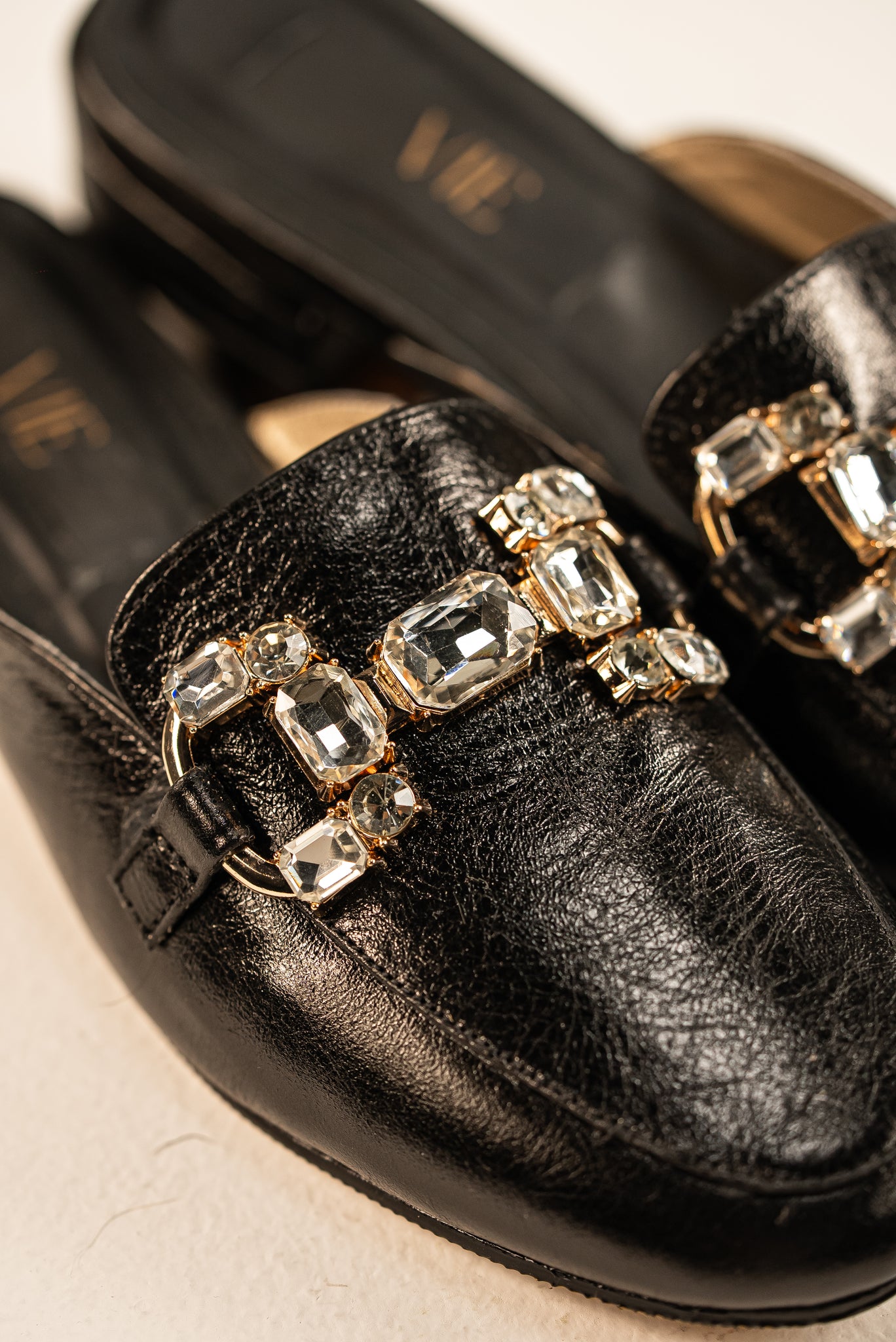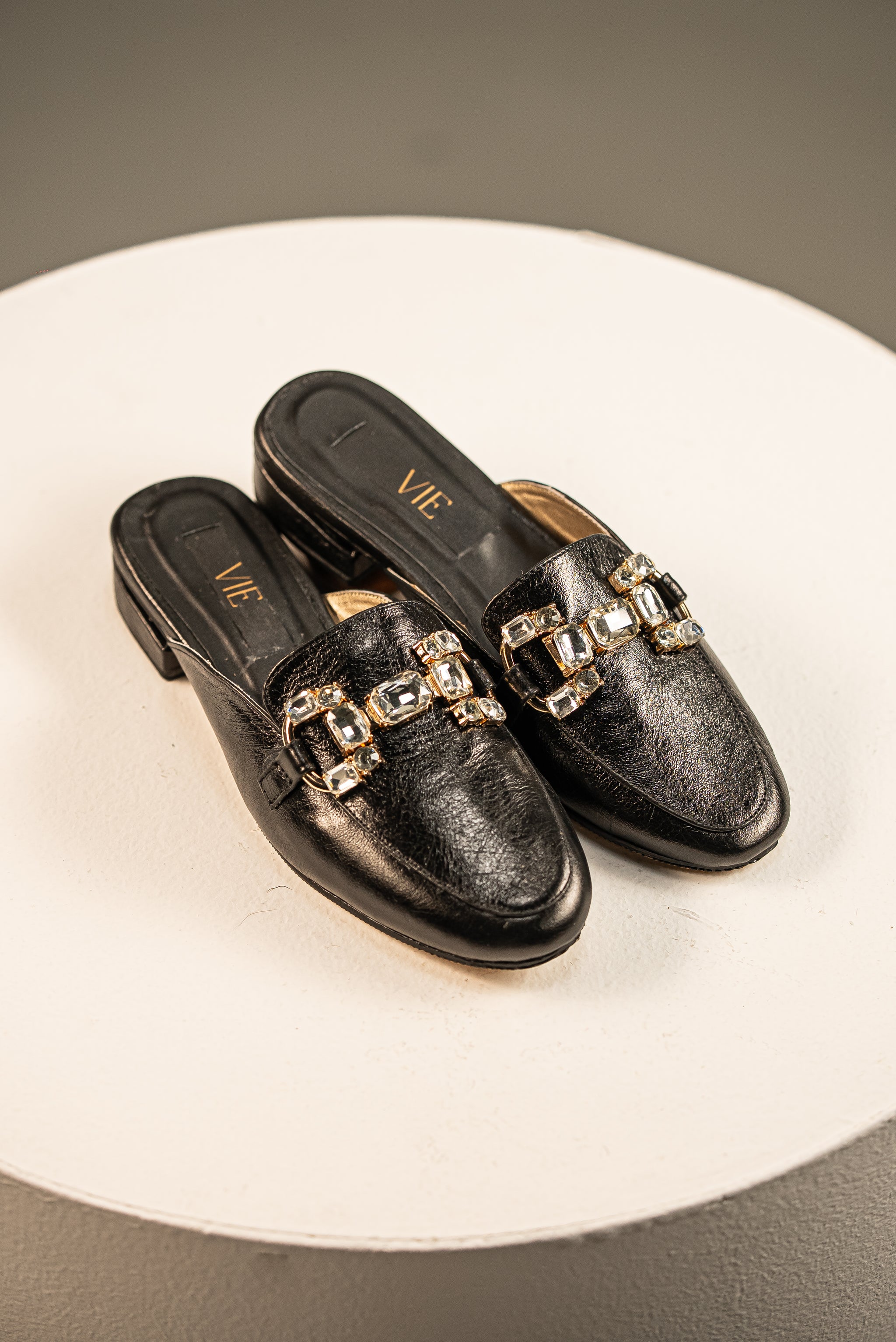 Son la pieza clave para un estilo audaz y elegante. Confeccionadas en un rico negro texturizado que evoca el lujo, estas mules sin talón presentan una deslumbrante hebilla adornada con cristales que contrasta perfectamente. Su diseño clásico de punta y tacón bajo ofrece una comodidad inigualable sin sacrificar la clase.