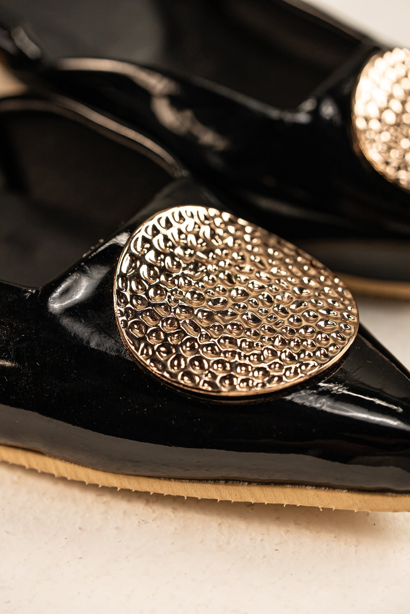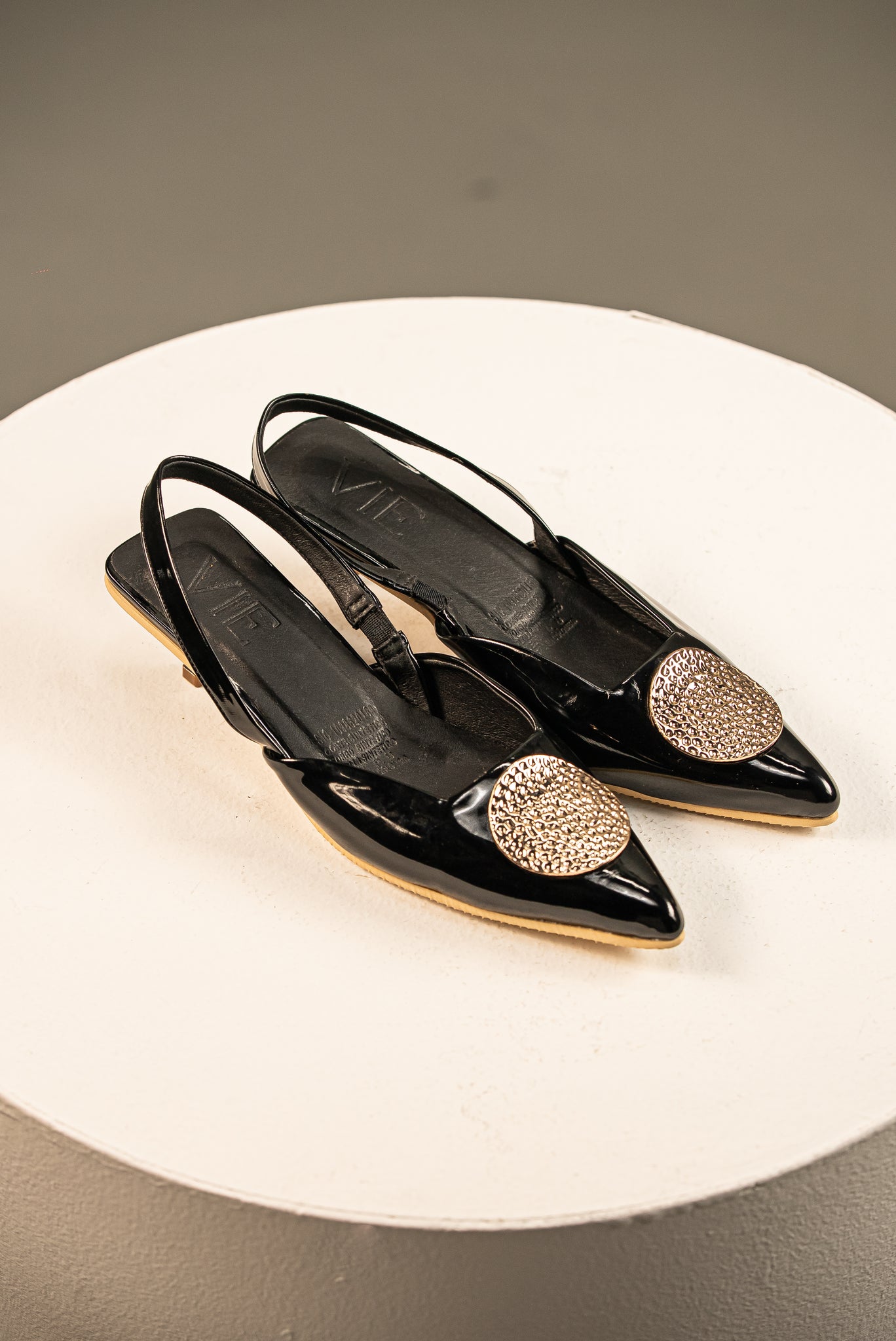 Capturan la atención con su acabado en charol negro pulido y su silueta clásica de punta. El verdadero encanto reside en el detalle: una aplicación frontal en forma de corazón, totalmente cubierta de glitter dorado o plata iridiscente. Su tacón kitten heel y la correa ajustable en el talón ofrecen la combinación perfecta de altura cómoda y sofisticación.