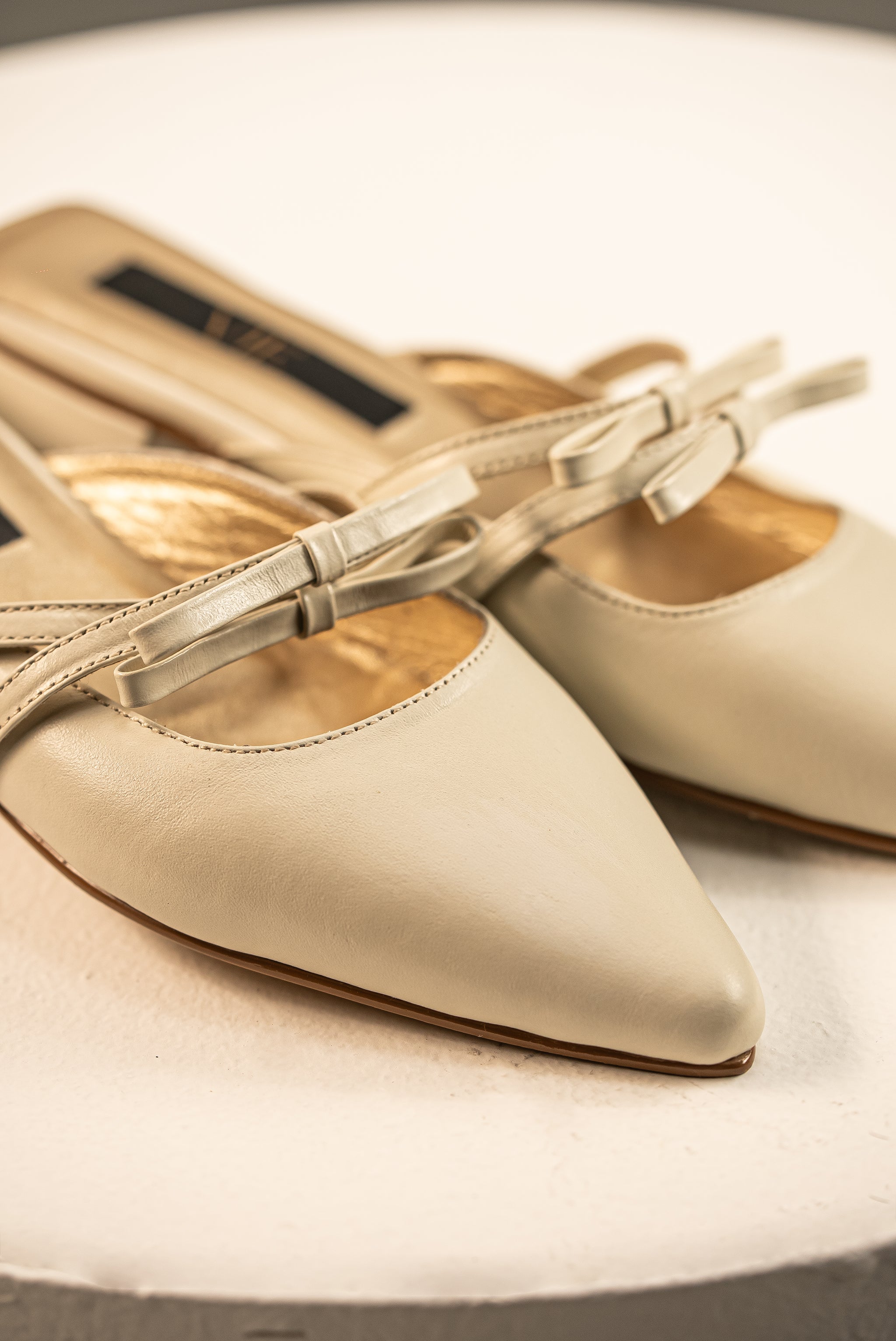 Son la definición de la elegancia moderna. Confeccionadas en un suave tono almendra/crema, presentan una sofisticada punta afilada y una delicada correa con un pequeño lazo sobre el empeine para un ajuste perfecto. Lo que realmente las distingue es su innovador tacón bajo apilado con forma circular/escultural, una declaración de moda por sí mismo.