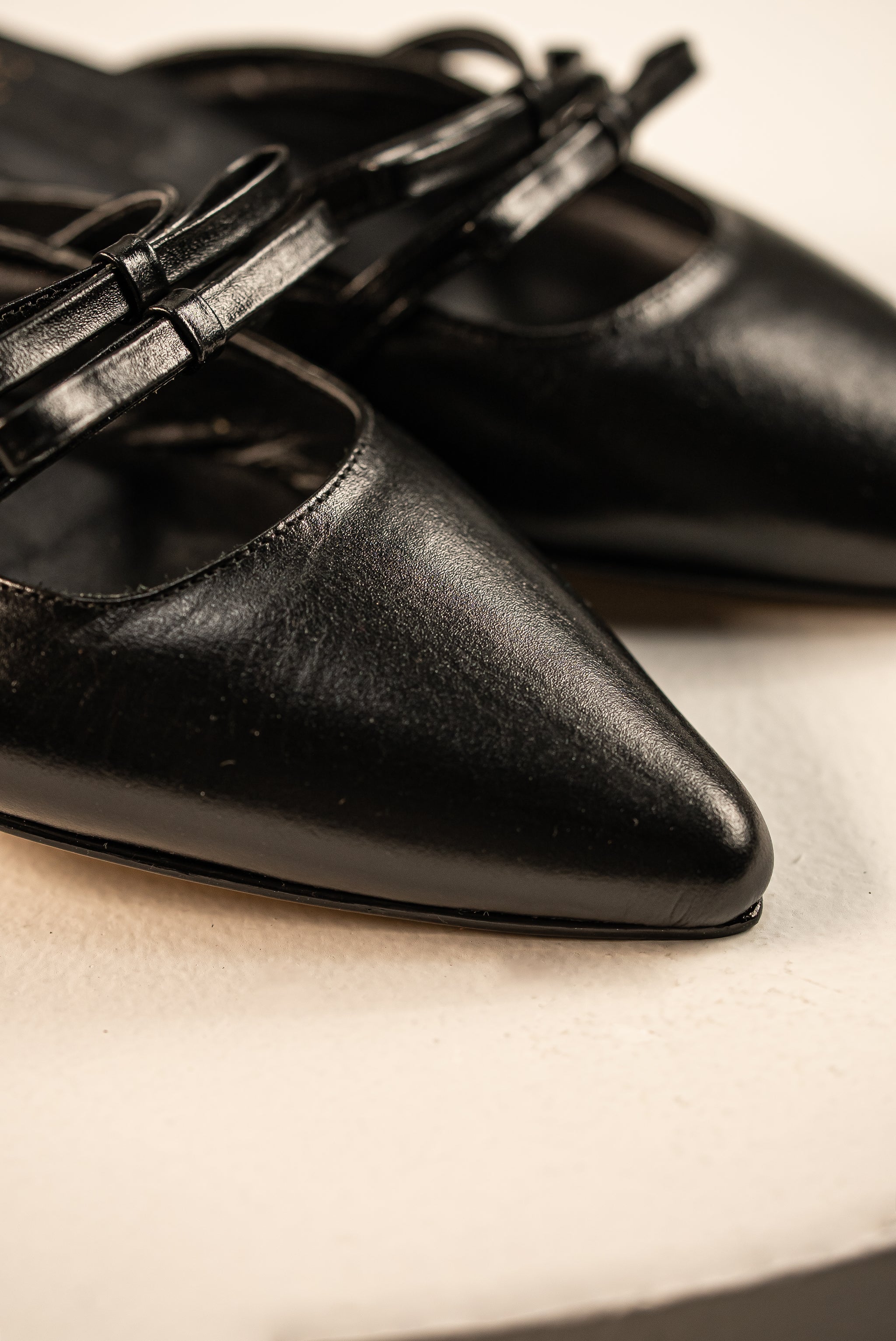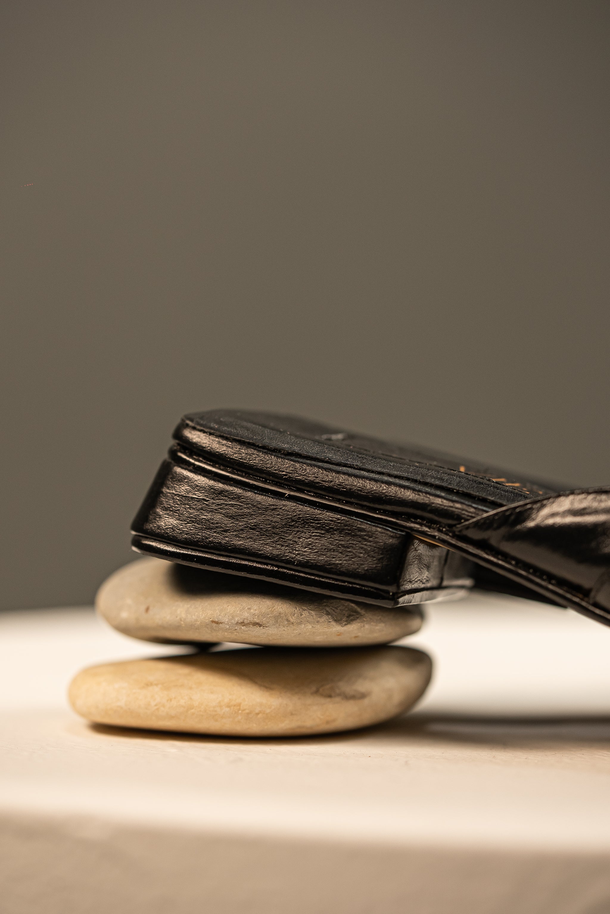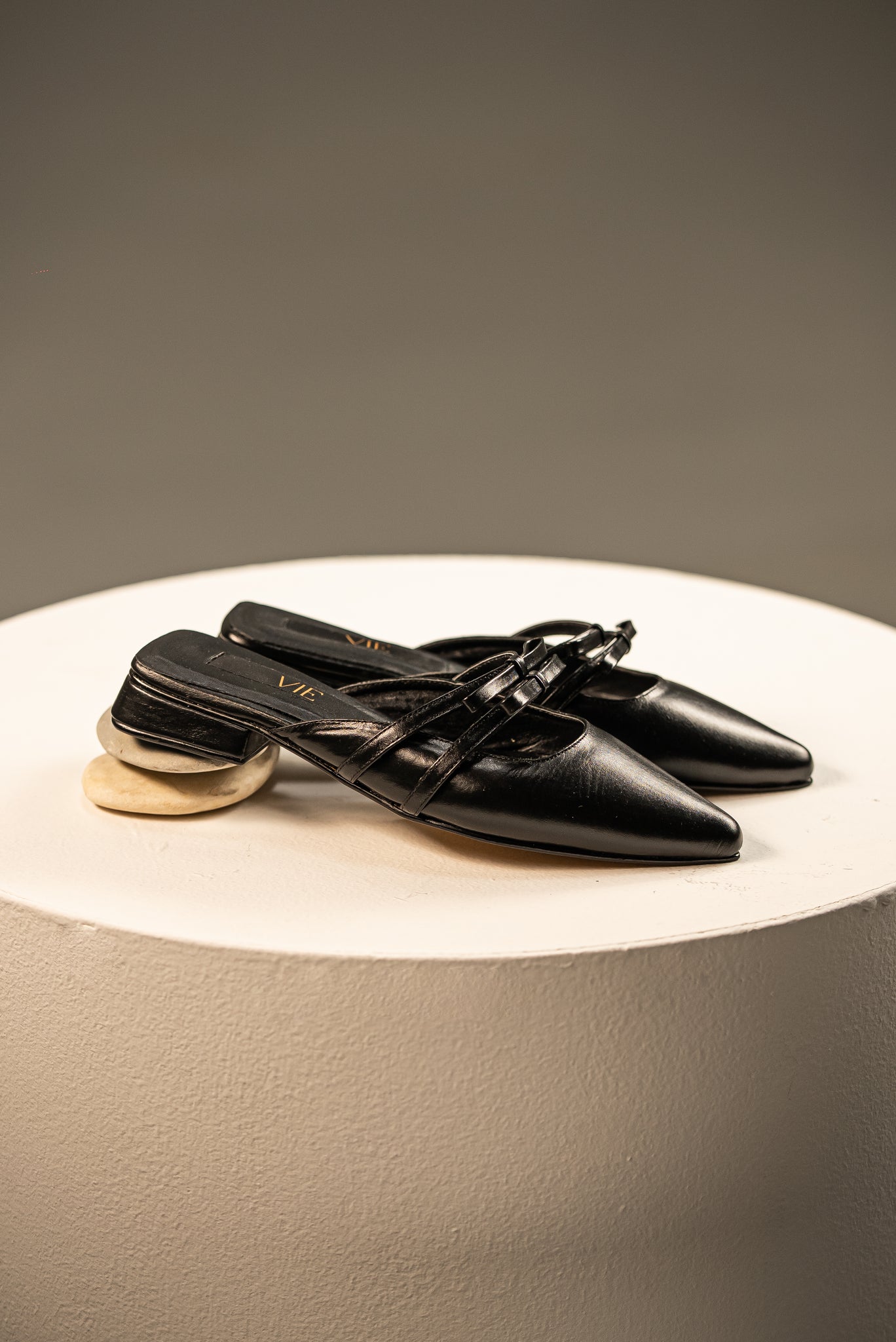 Presentamos la fusión perfecta entre diseño audaz y comodidad. El clásico cuero negro contrasta con las finas correas estilo caged (jaula) que adornan el empeine, ofreciendo un toque vanguardista. Elevadas por un tacón bajo con diseño geométrico y distintivo, estas mules garantizan una pisada cómoda y una silueta llamativa.