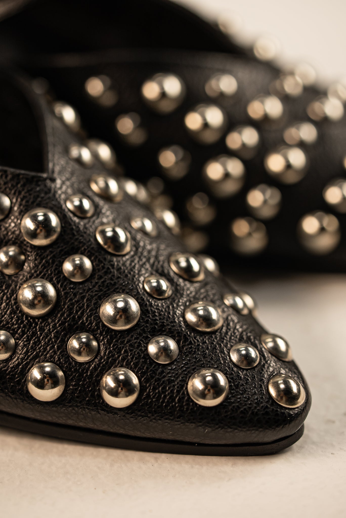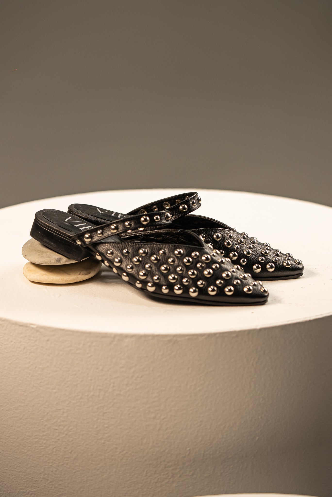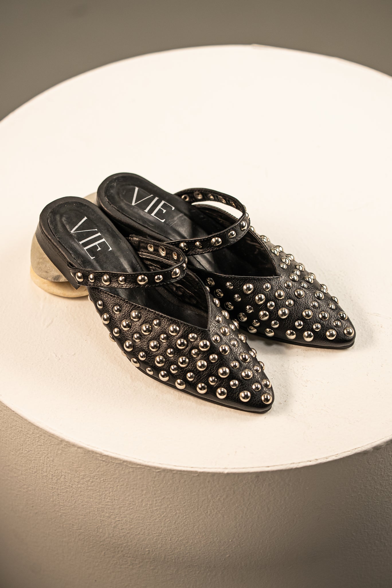 Estas mules de punta afilada fusionan el cuero negro con una capa de estoperoles metálicos plateados, creando un look rock-chic inolvidable. La correa delgada en el empeine asegura el pie. Son el accesorio perfecto para inyectar rebeldía y vanguardismo a cualquier outfit.