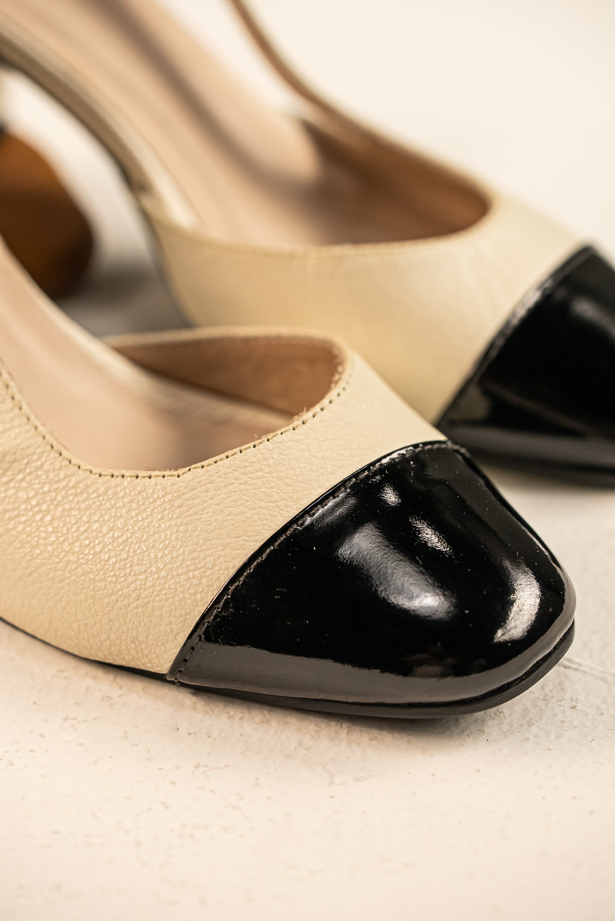 El equilibrio perfecto. Confeccionados en suave cuero, estos slingbacks combinan un cuerpo en tono crema versátil con una puntera negra pulida. Ideales para transicionar del día a la noche con un toque de lujo.