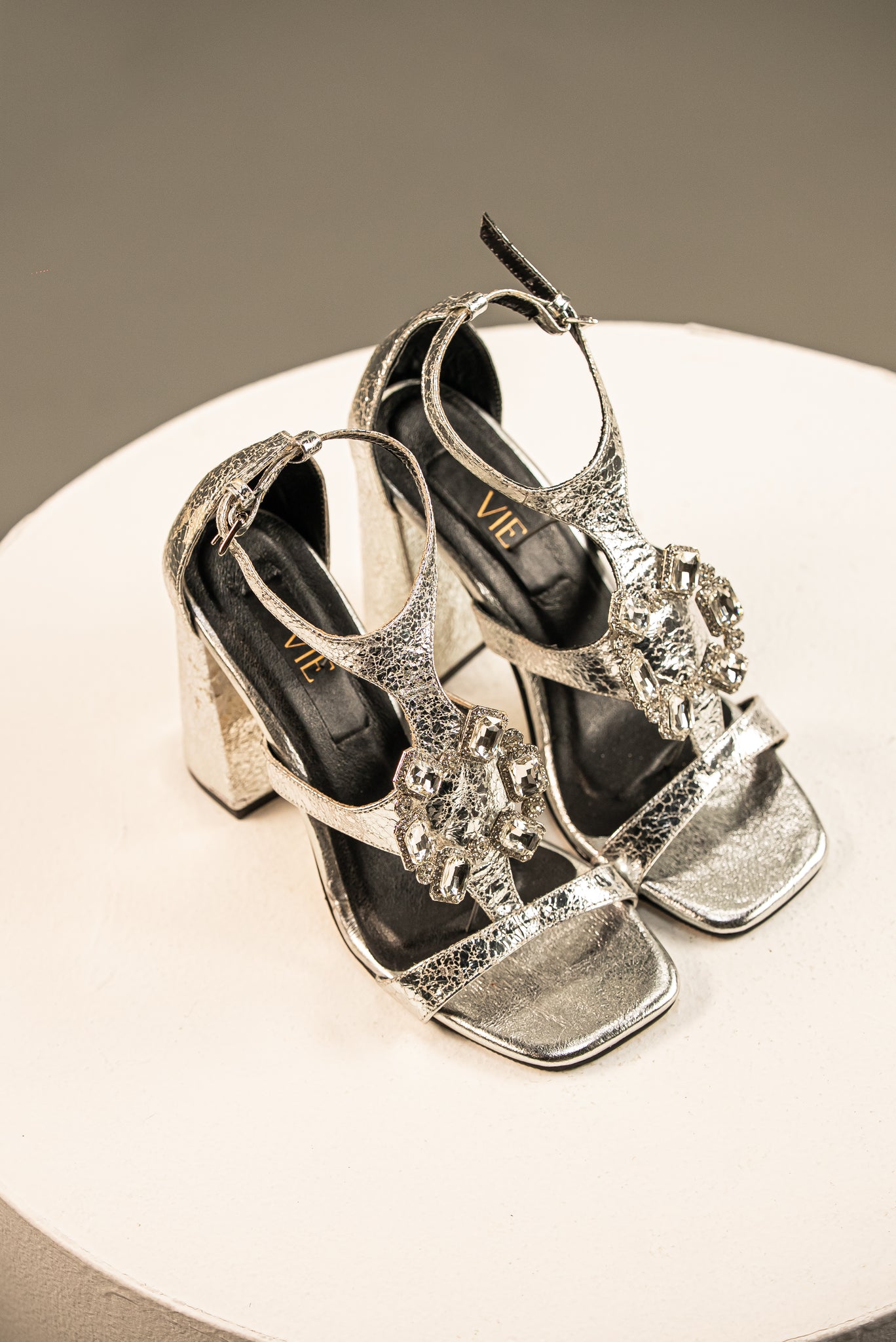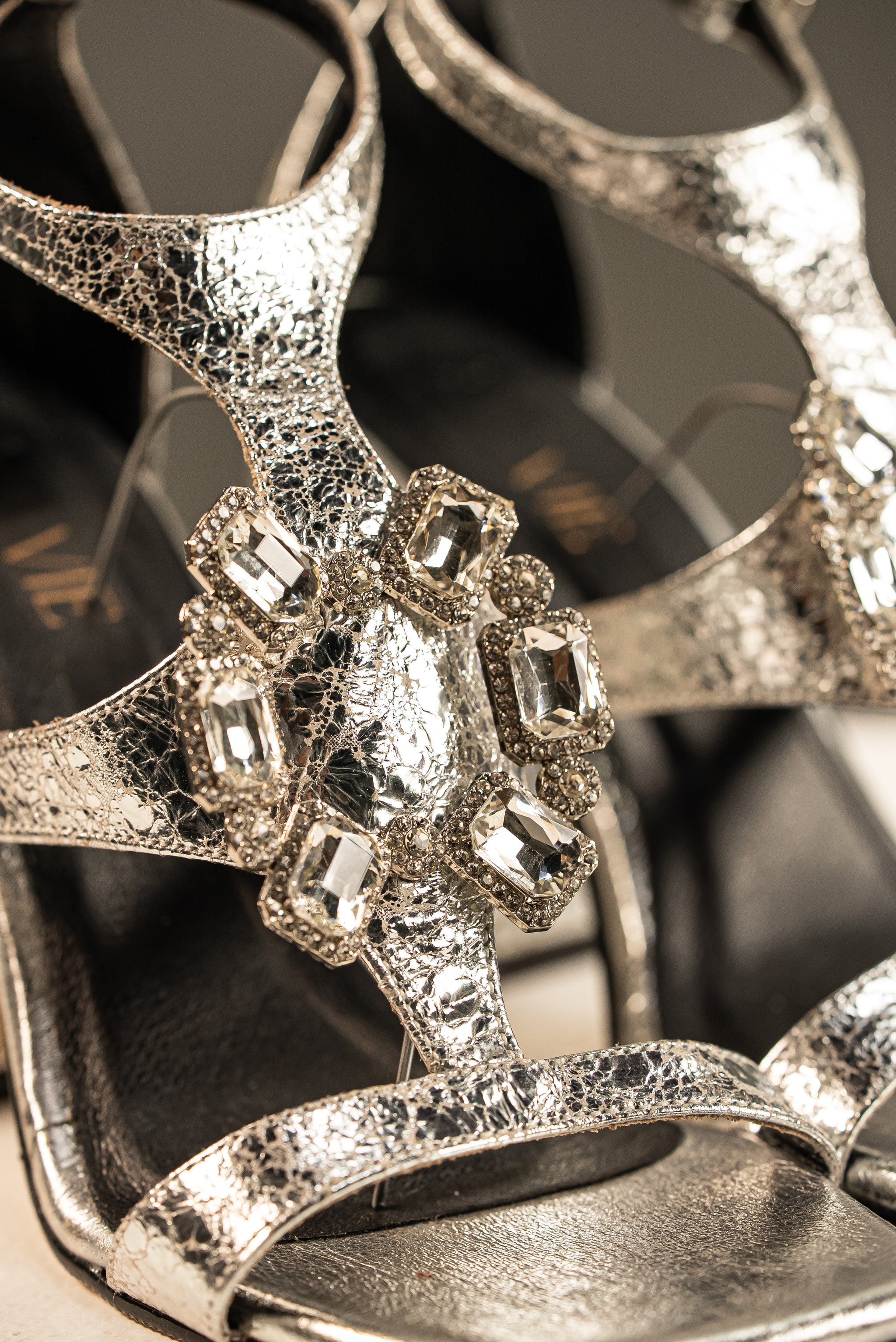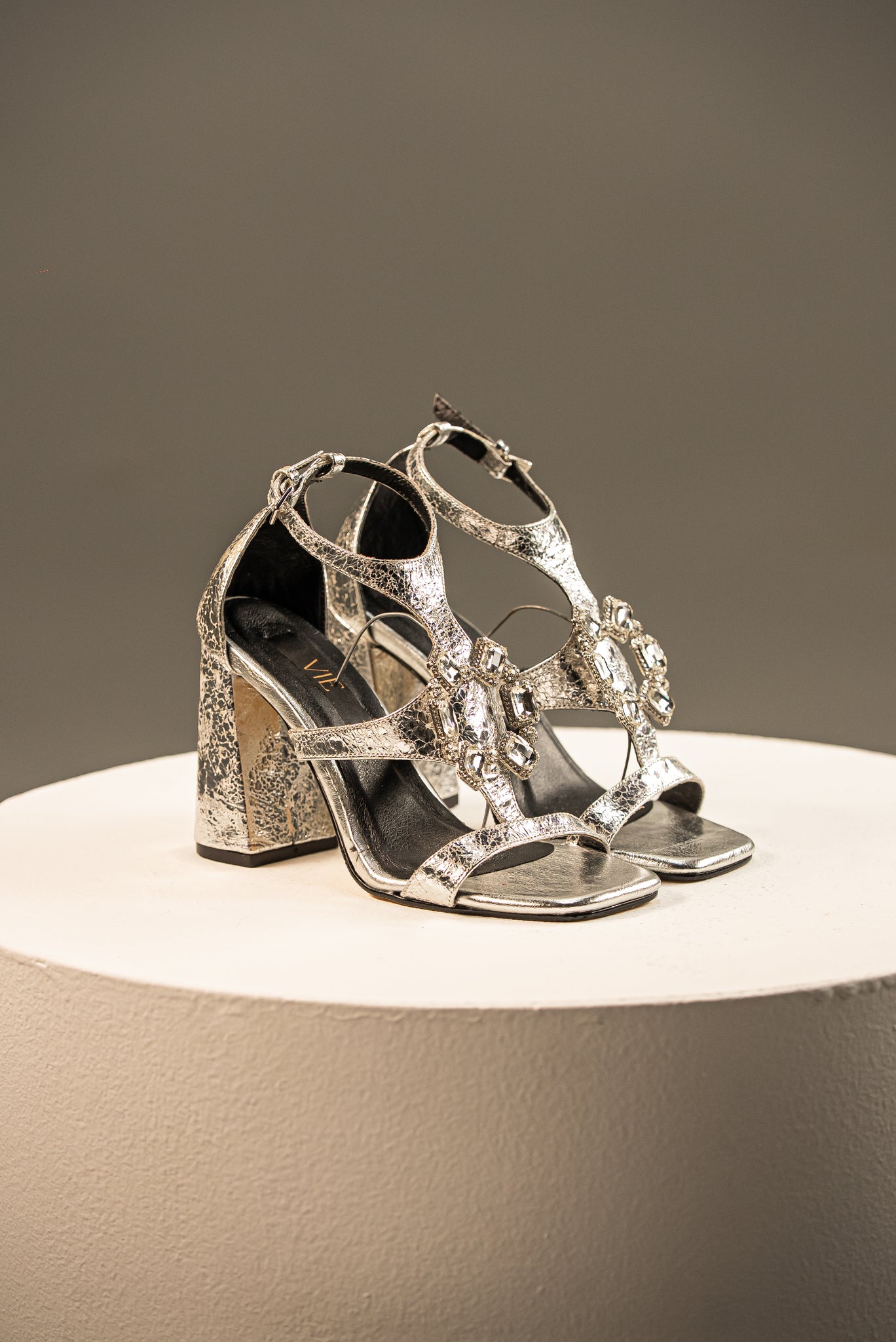 Confeccionadas en cuero con un vibrante acabado metálico plateado y una textura craquelada, estas sandalias se distinguen por el opulento aplique de pedrería. El tacón de bloque y la puntera cuadrada ofrecen estabilidad con una elegancia de alfombra roja.