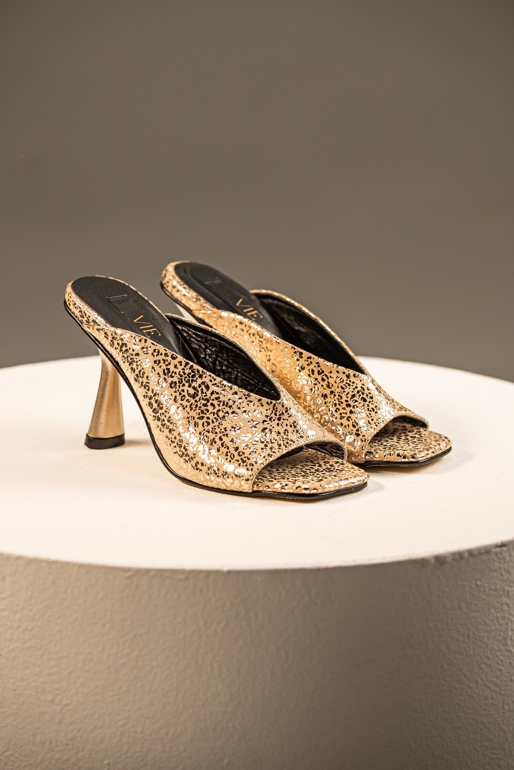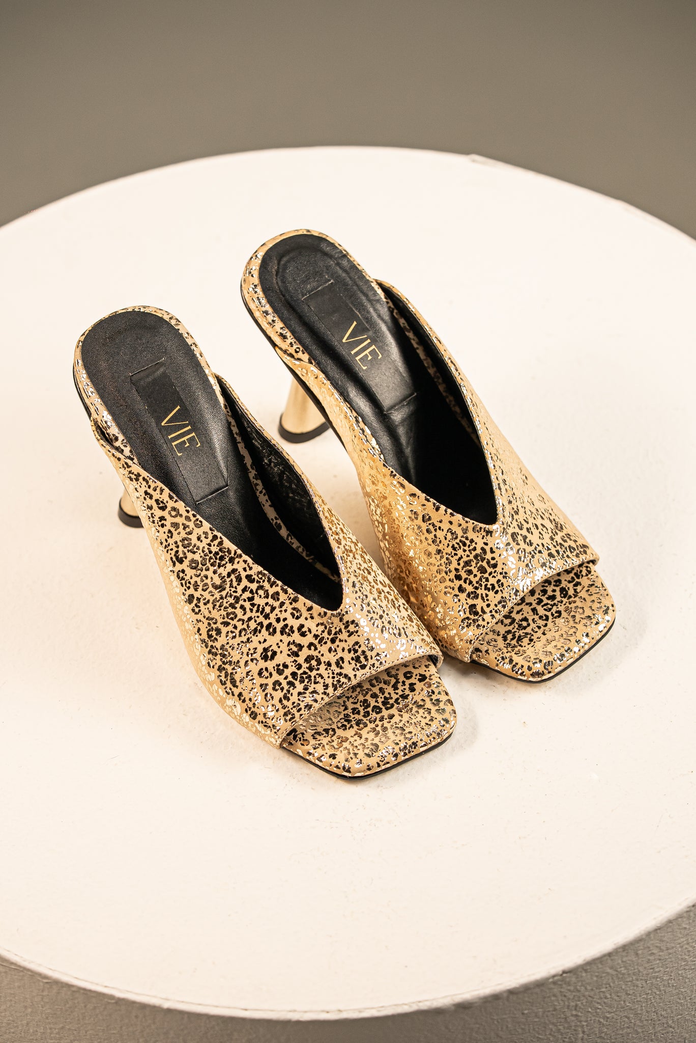 La exquisitez del cuero mule se maximiza con el detalle del foil dorado. La textura de leopardo y el tacón a juego crean una pieza cohesiva y lujosa. El toque de glamour para un estilo vanguardista.