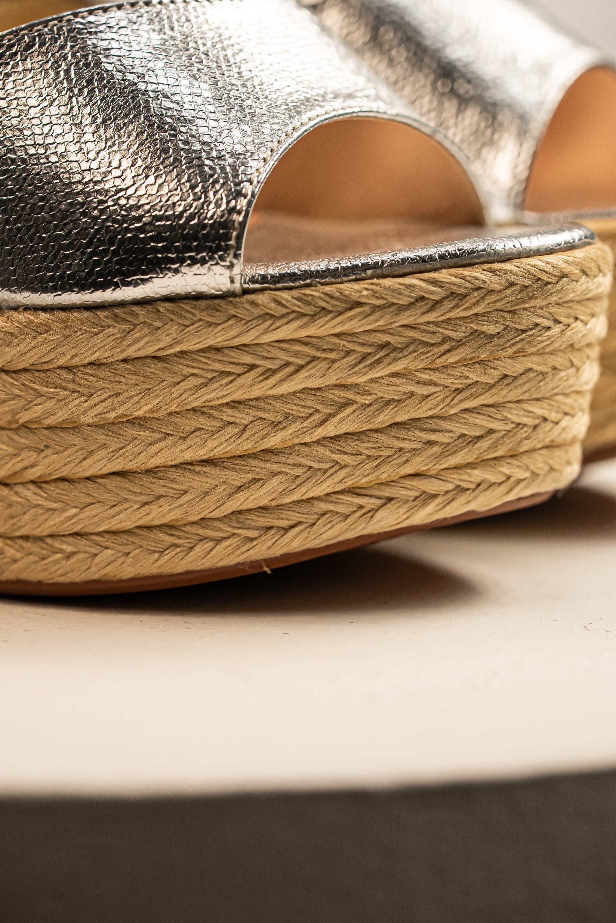 Atrevido y a la moda. La mezcla de la textura artesanal del yute con el brillo futurista del sintético plateado ofrece un calzado único. La correa tobillera garantiza el ajuste perfecto y el confort.