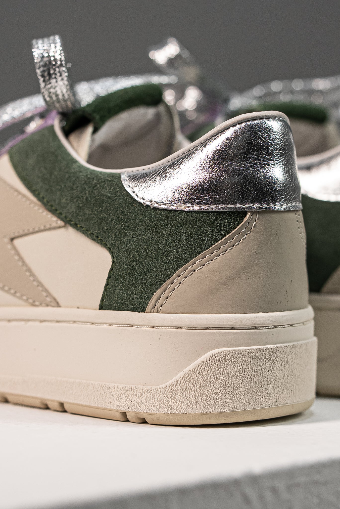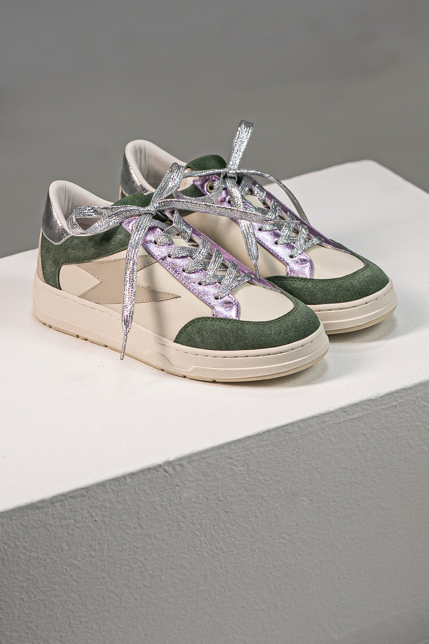 Zapatillas de cuero que fusionan tonos: base en cuero Crema, paneles de gamuza verde oliva/bosque y detalles centrales en Lila Iridiscente con acabado metálico. Se completan con un contrafuerte plateado en el talón y cordones de glitter. Un calzado cómodo y trendy que inyecta color y sofisticación a tu estilo diario.
