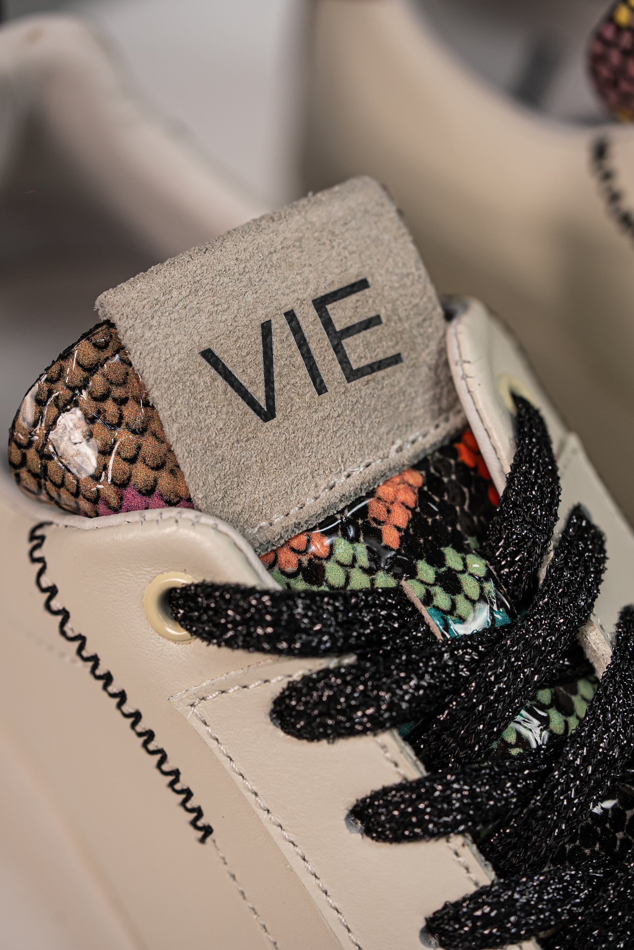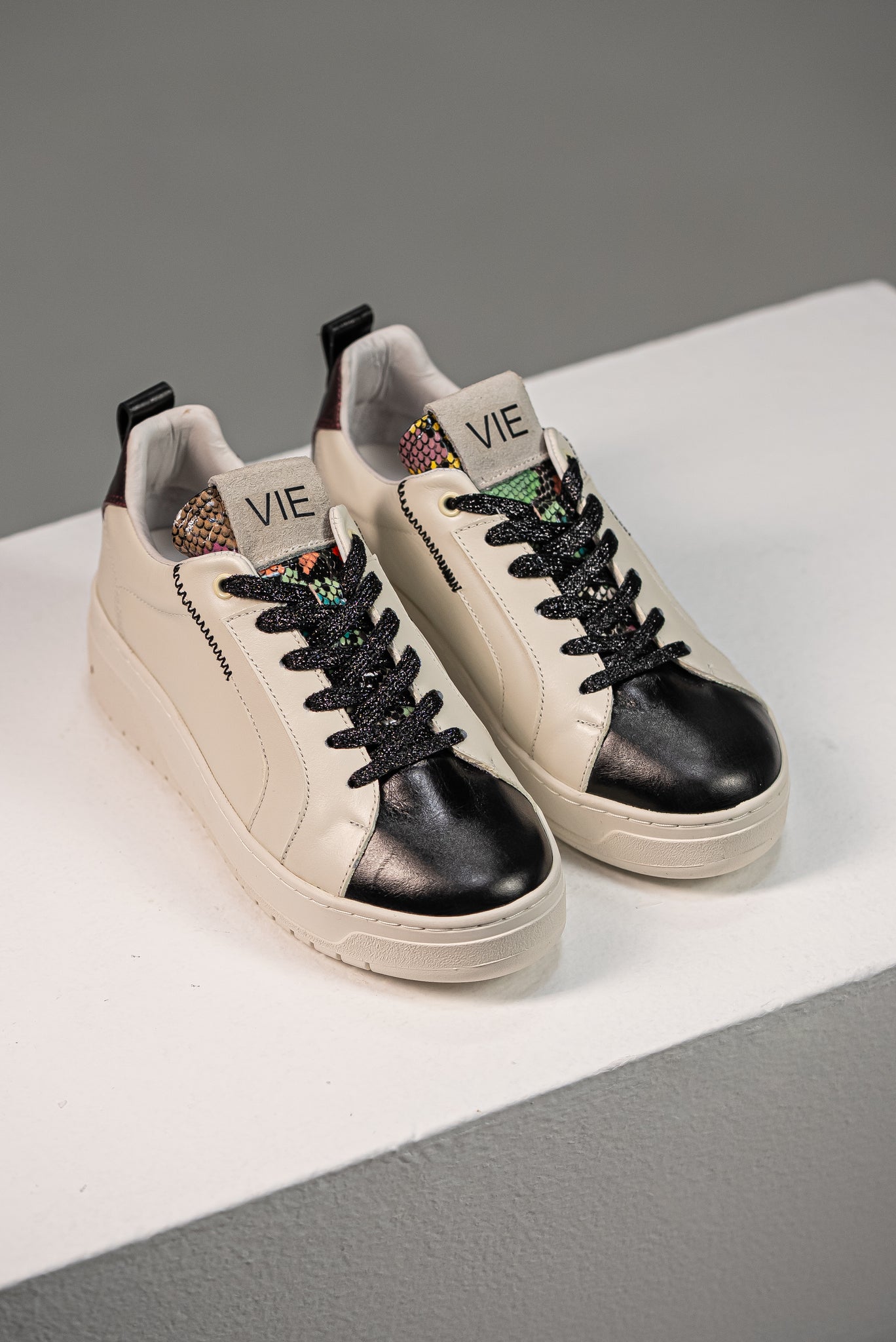 Zapatillas de diseño low-top con base en cuero Crema y una elegante puntera en Negro que crea un contraste audaz. El toque de lujo lo aporta el contrafuerte en cuero Vino Metálico brillante y los detalles de animal print multicolor en la lengüeta. El calzado perfecto para un look pulido, moderno y versátil.