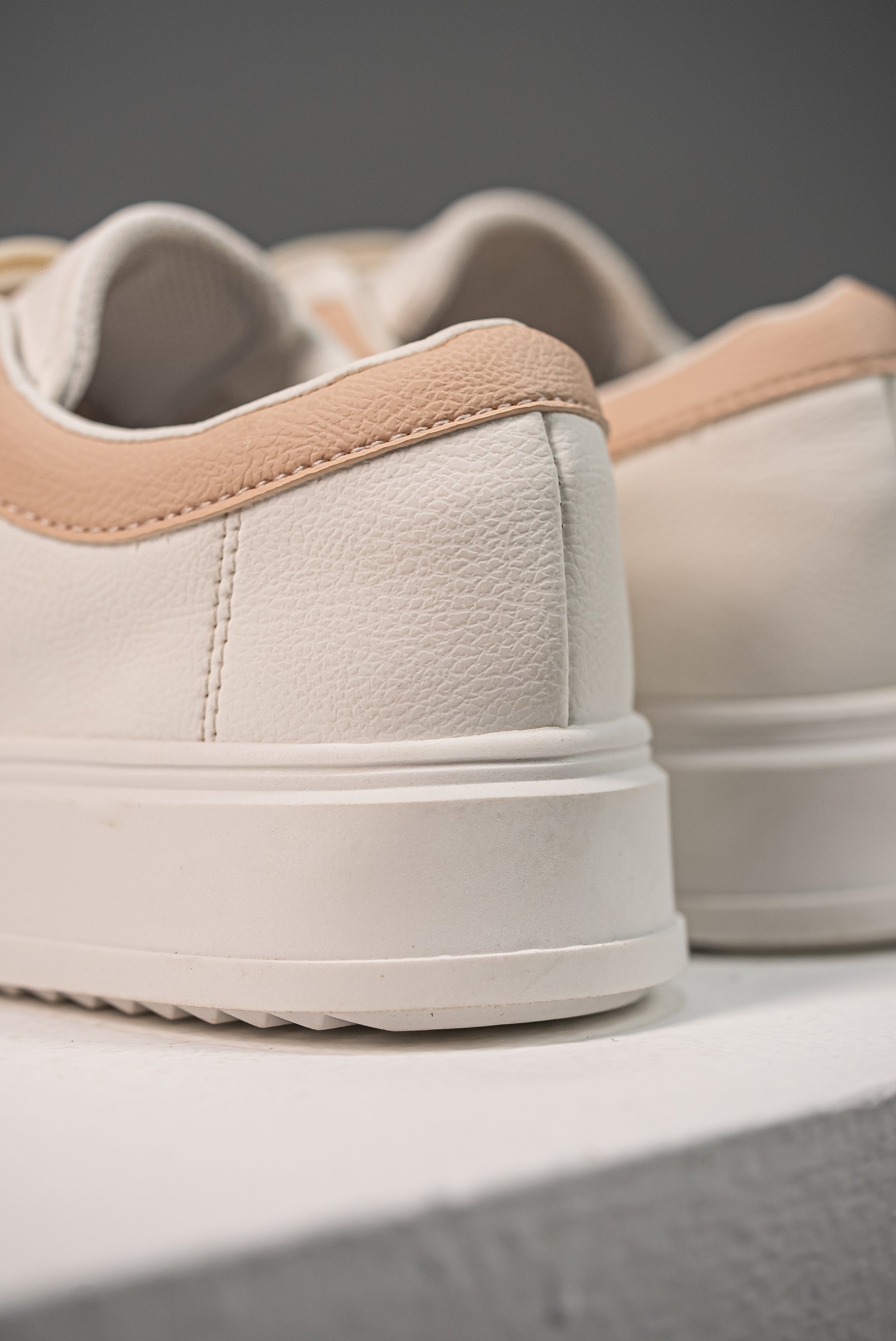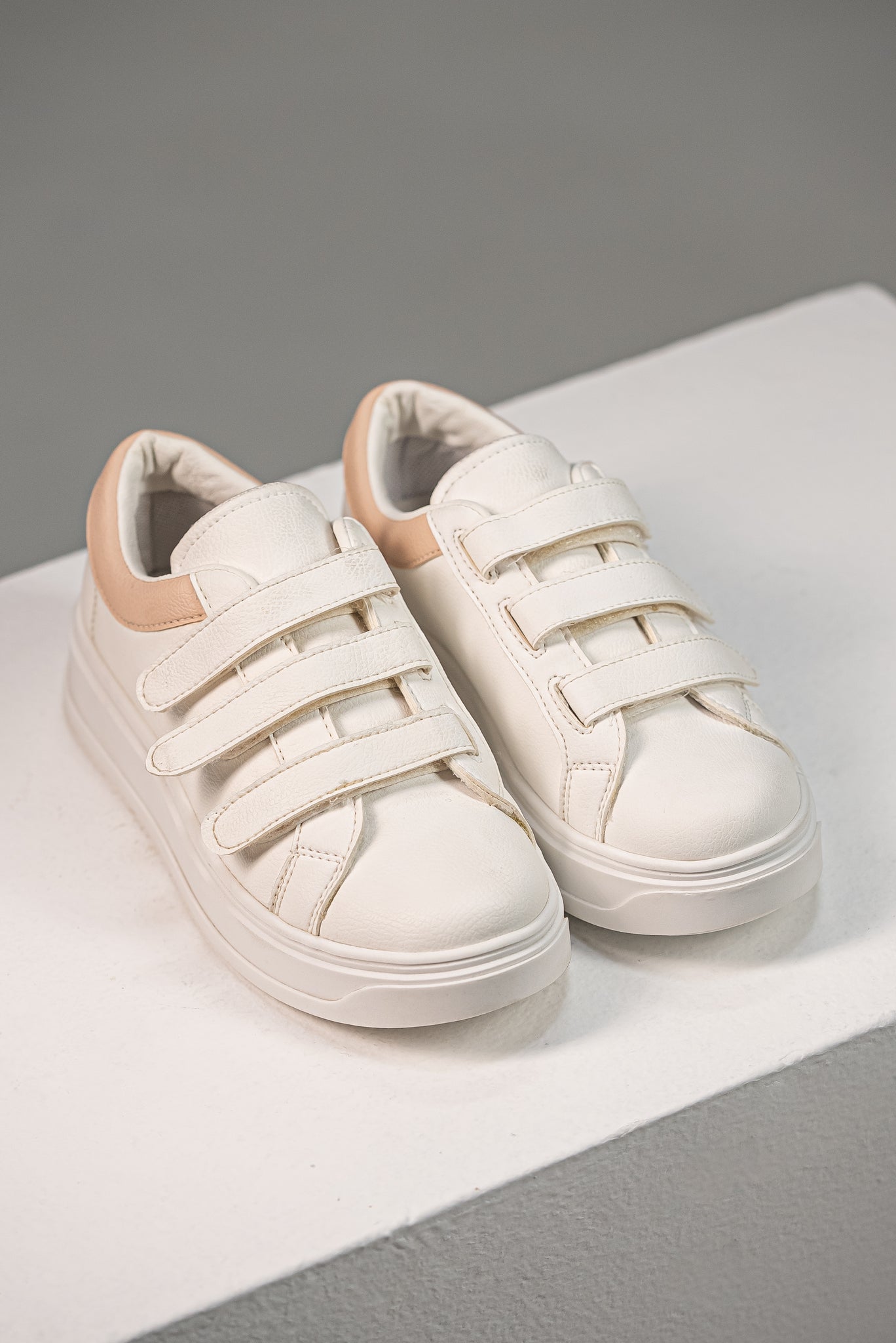 Su diseño minimalista en blanco puro se realza con un discreto toque nude o rosa pálido en la parte superior del talón. Olvídate de los cordones; sus tres cierres de velcro aseguran un ajuste perfecto y te permiten calzarte y descalzarte en segundos. El complemento ideal para un look pulido y sin esfuerzo.
